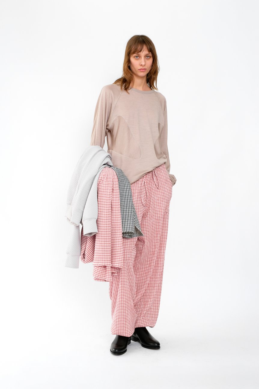 ファーストシーズンとなる2026年秋冬コレクションの着想源となったのは、デザイナーのパートナーの出身地でもあり、自身も度々訪れているという国、モンゴル。同地の観光地ではない街で目にした、普通の家の赤い屋根が数十年経って褪せたピンクをはじめ、パープルやブルー、マスタードなど、旅や日常の中で潜在的に捉えたニュアンスのあるカラーをコレクションに落とし込んだ。また、同ブランドでは「黒」のアイテムを作らないこともこだわりの一つ。デザイナーは、「黒は何にでも合ってしまうからこそ、少し面白みに欠けたり『逃げ』のようにも感じられる色。アマージュユノイの服を手に取ってくださるお客さまには、一歩勇気を出してスタイリングの楽しさや新しい発見をしてほしい」とその思いを語る。