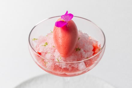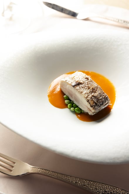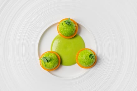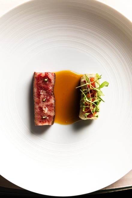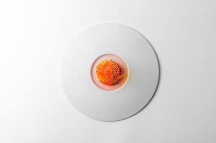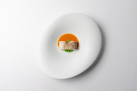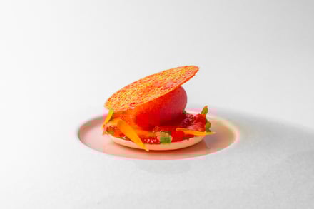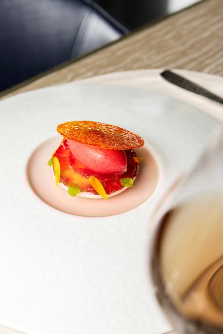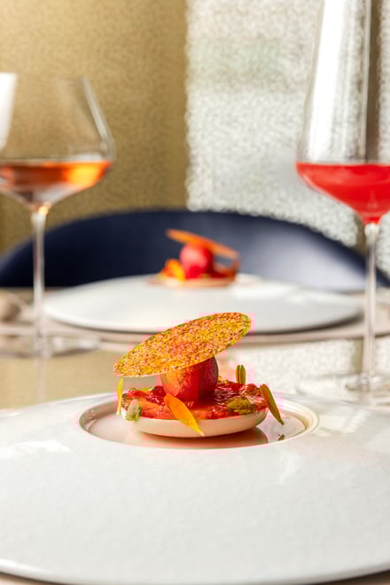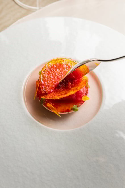 第1弾は愛媛県をフィーチャー。ブルノ・昼間氏は、瀬戸内の温暖な気候や海と柑橘、素材を活かす食文化が、地中海やイタリアと共通する美意識を持つことに着目した。コースは、山間に古くから息づく郷土料理に着想を得たアミューズから始まり、愛媛県産の太刀魚やあか牛など地元の食材に、「トリッパ・イン・インサラータ」や「ファーヴェ・エ・ペコリーノ」といった伝統的なイタリア料理の要素を掛け合わせた料理を用意。デザートには、愛媛県産ブラッドオレンジを主役にした「ブラッドオレンジ」が提供される。価格はランチが1万9000円、ディナーが2万9000円。