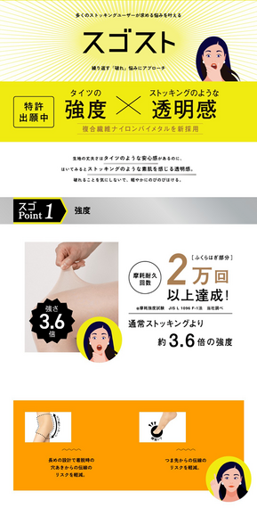強さと透明感を両立した「スゴスト」のランディングページは新発想の糸設計や耐久性の検証などの技術的な背景も紹介