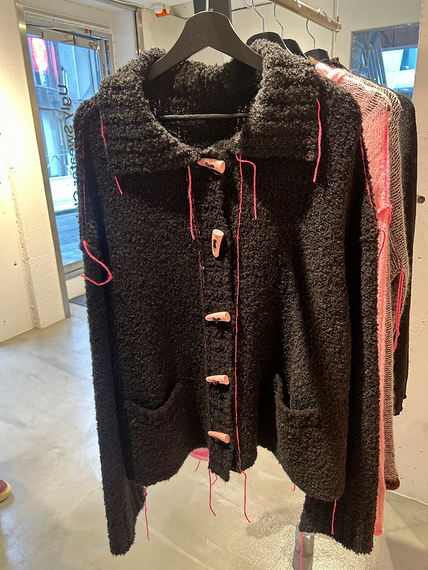 26~27年秋冬は祖父の古い写真に写っていたニットの帽子などをヒントに企画した。モコモコとした素材のトグルボタン付きカーディガンは、あえて未処理で垂れ下がらせたピンクの糸がアクセント。裏地を表にして抜け感を出したセーターや、ざっくりとしたニットポロシャツはユニセックスでも着られる。