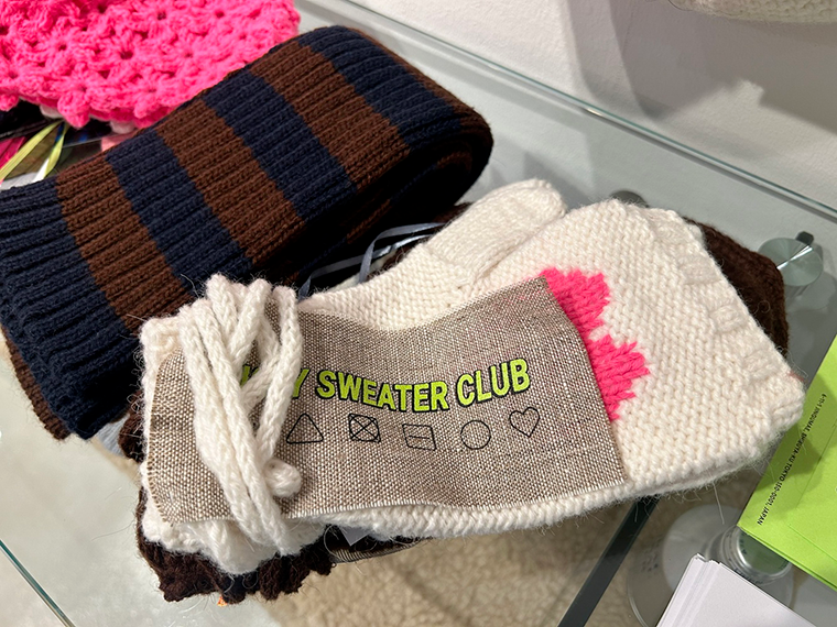 レディスニットウェア主力の「アグリーセータークラブ」は、カラフルでアート感覚あふれるデザインが魅力のブランドだ。デザイナーのアンジェリカ・バラエバさんはロシア出身。羊毛を紡いで生活していた家族のルーツを意識し、ロシア産の昔ながらの製法による物作りにこだわっている。