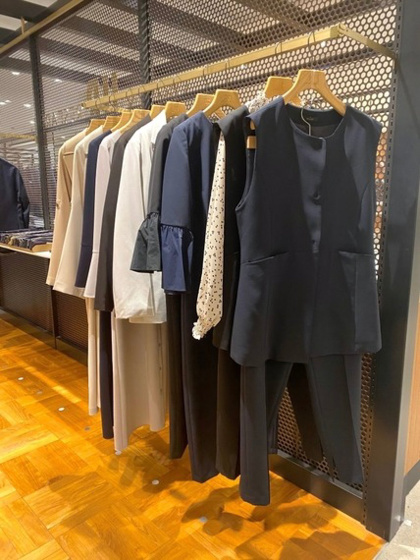 アーバンリサーチなんばシティ店はこれまでより品揃えの幅を広げたオケージョン向け商品が好調に推移している。色はネイビーを中心に、ジレとパンツ、ノーカラーのペプラムジャケットとパンツなどの組み合わせが人気だ。