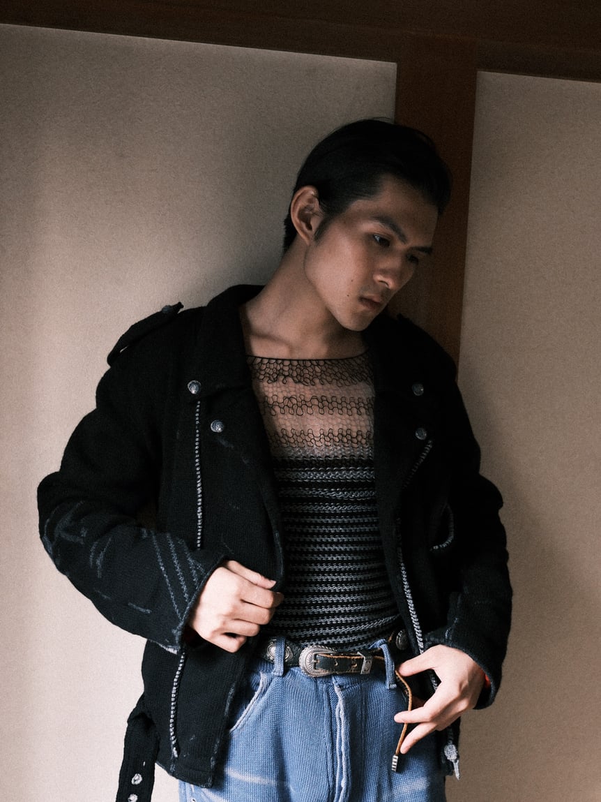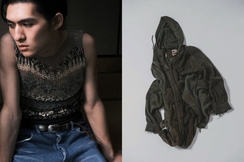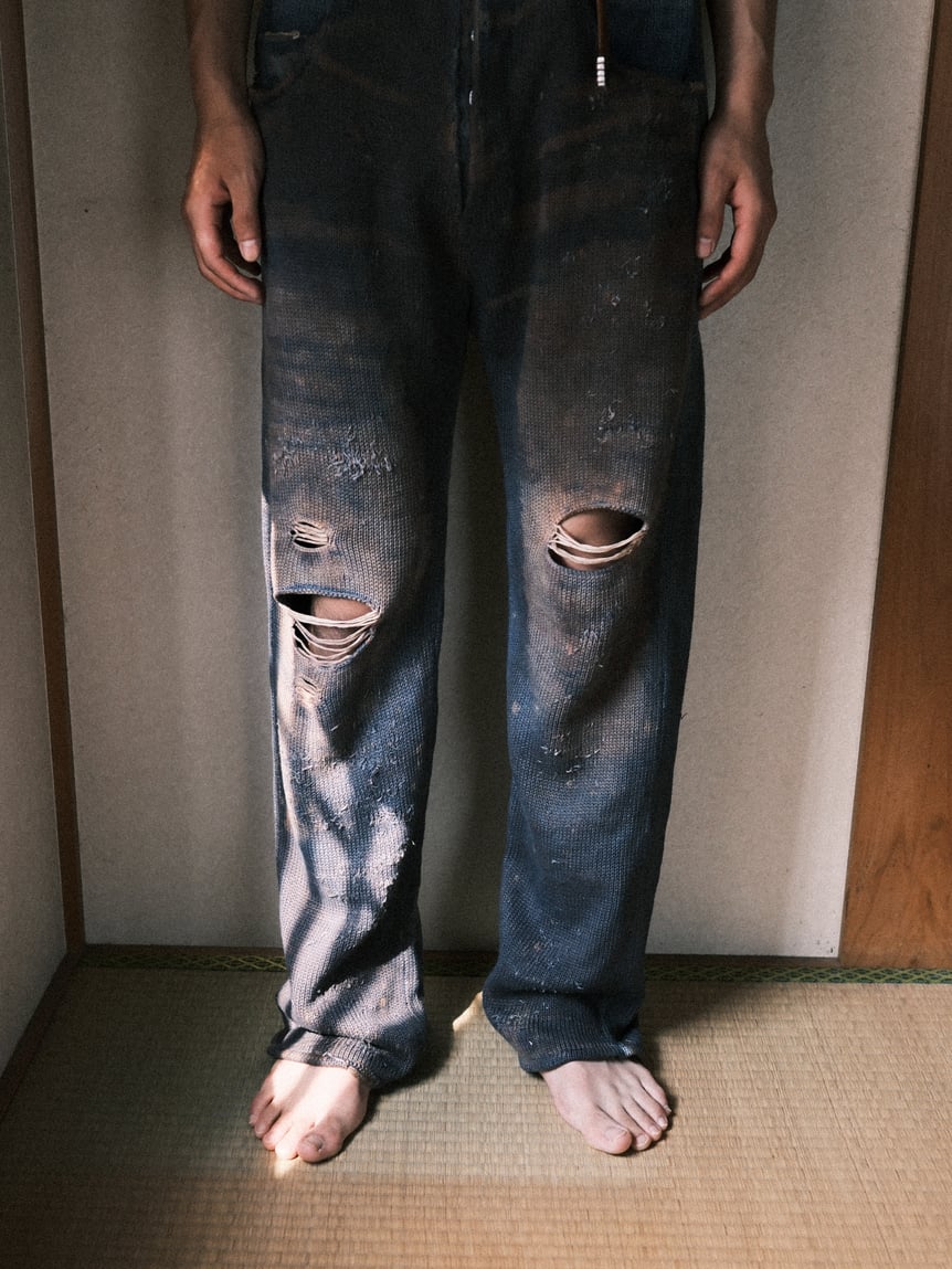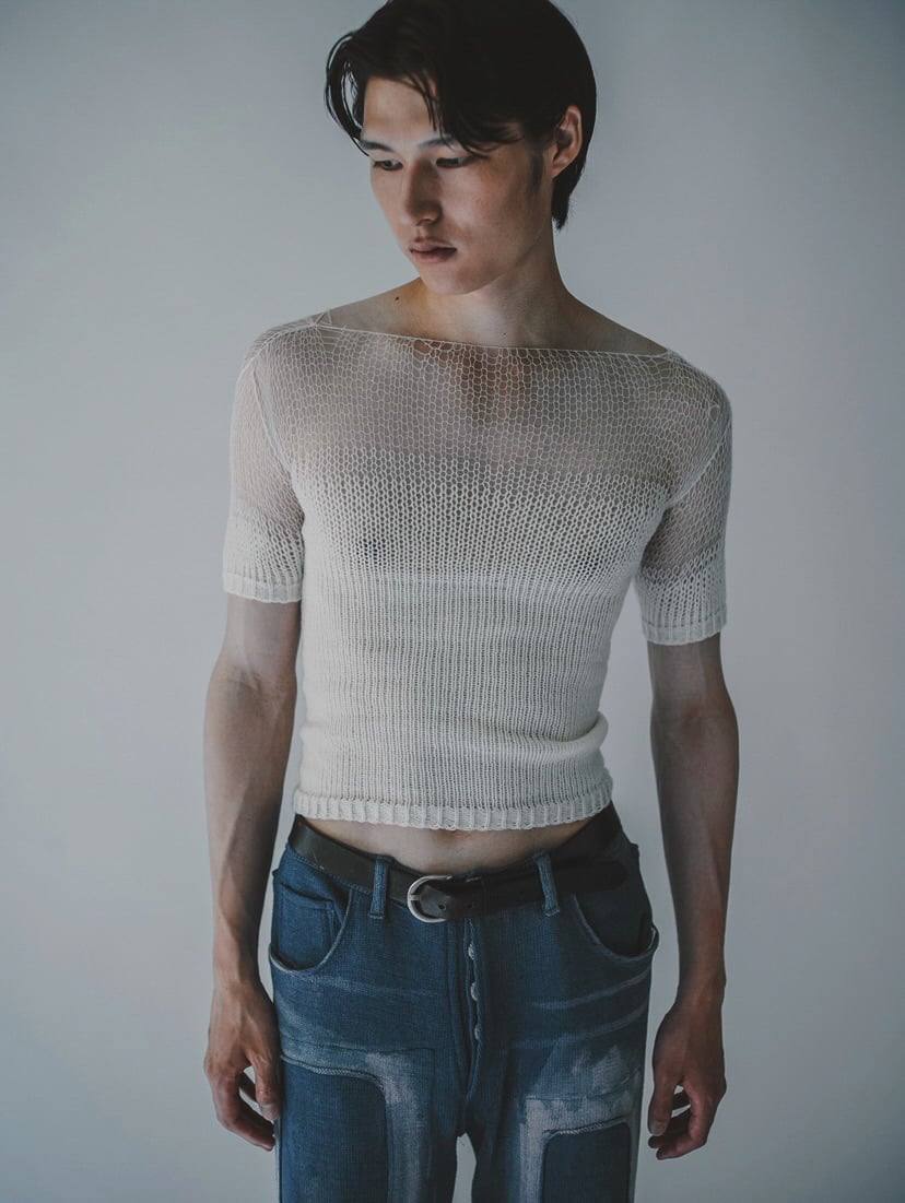 もう一つの軸は、消えゆくものに形を与える「輪郭を付ける」シリーズ。デザイナーが元々着用していたライダースジャケットや、着用困難なほど経年変化した古着のミリタリーコートやデニムなどをニットで精密に再現した。家庭用編み機と手編みを駆使し、金属製のジッパーやボタン、裏地のキルティング、生地のダメージに至るまで、すべてを編み組織のみで表現しているのが特徴だ。鶴岡は、「ニットは1目単位でデザインできるため、布帛にはない歪みや動きを生み出すことができる。表現の幅が無限にあることがニットの魅力であり、そこに一番のやりがいを感じている」と話す。