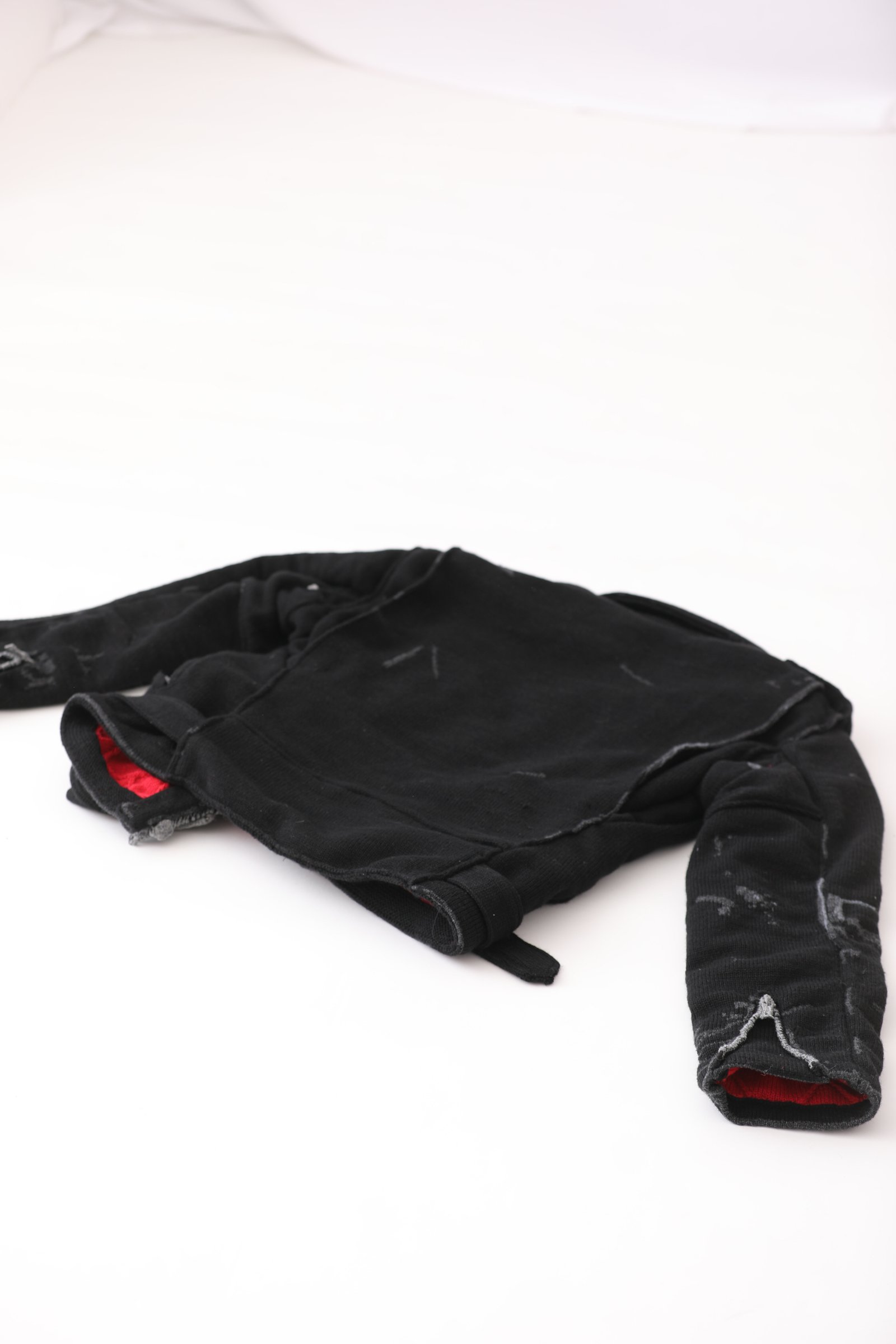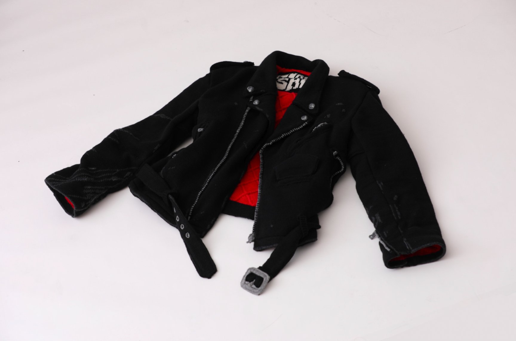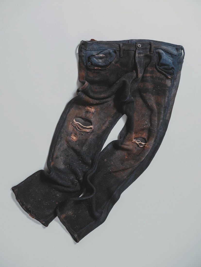 もう一つの軸は、消えゆくものに形を与える「輪郭を付ける」シリーズ。デザイナーが元々着用していたライダースジャケットや、着用困難なほど経年変化した古着のミリタリーコートやデニムなどをニットで精密に再現した。家庭用編み機と手編みを駆使し、金属製のジッパーやボタン、裏地のキルティング、生地のダメージに至るまで、すべてを編み組織のみで表現しているのが特徴だ。鶴岡は、「ニットは1目単位でデザインできるため、布帛にはない歪みや動きを生み出すことができる。表現の幅が無限にあることがニットの魅力であり、そこに一番のやりがいを感じている」と話す。