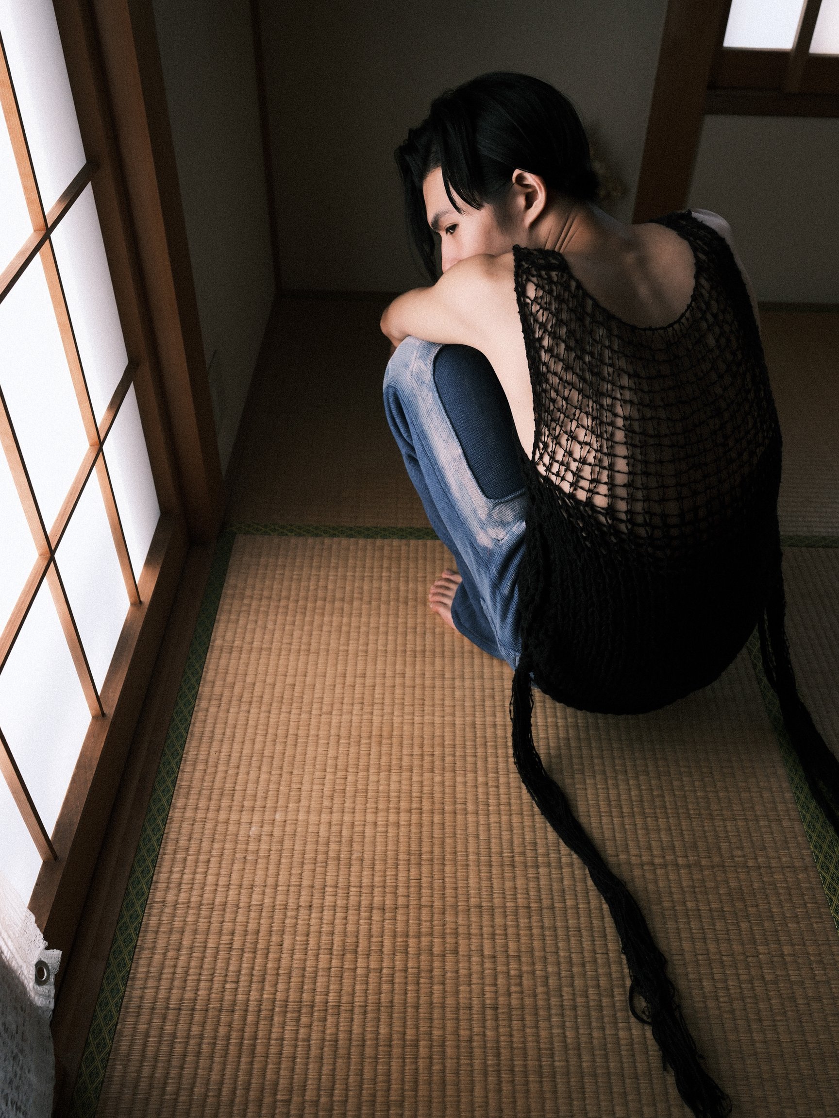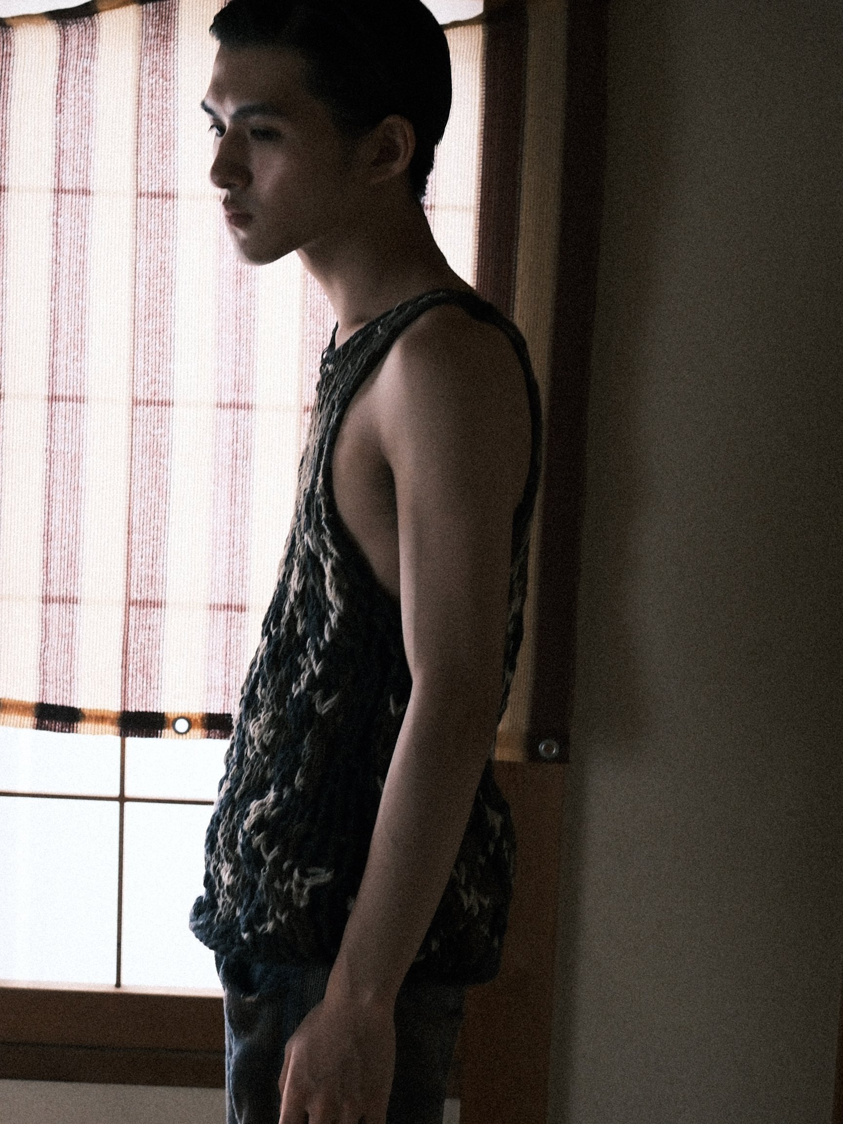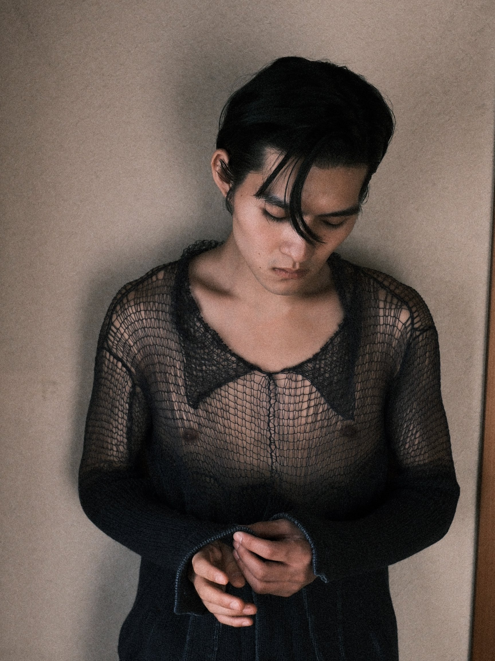 ファーストコレクションのテーマは「記憶を編む」。着想源は、かつて「東洋一のマンモス団地」と呼ばれた埼玉県草加市の「松原団地」だ。鶴岡が幼少期を過ごしたその住宅地は小学生のころに取り壊され、公園や学校を含む街全体が消滅。同コレクションでは、自身の中で年々薄れていく街の風景や記憶を「徐々に消えていく」というコンセプトに置き換え、ニット表現へと落とし込んだ。