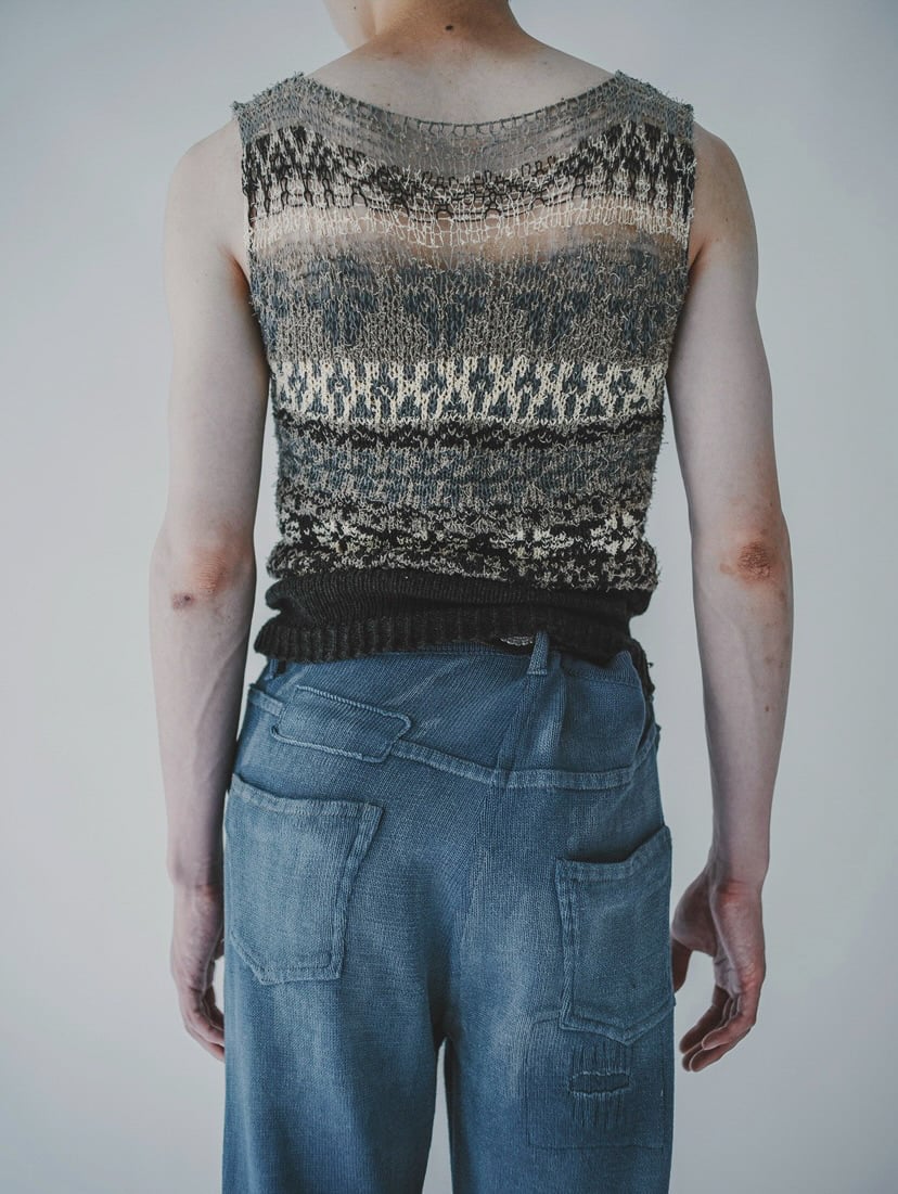 コレクションのラインナップは、「徐々に消えていく」さまを異なる形で視覚化した2つのシリーズで構成される。一つ目は「輪郭を消す」アプローチとして、フェアアイル柄やボーダー柄のニットベストをベースに、裾から上に向かって段階的に糸の本数を減らす技法を採用。上部にいくほど編み目が粗くなり、透けていくようなグラデーションによって、記憶が曖昧になっていくさまを表現した。