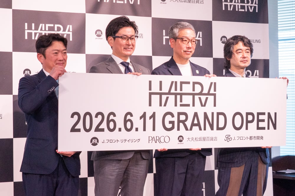 ハエラは、愛知県名古屋市中区錦3丁目に同日開業する施設「ザ・ランドマーク名古屋栄」の地下2階から地上4階にオープンする新たな商業施設。同地区には既にJ.フロント傘下であるパルコと松坂屋が営業しており、それぞれが競合になるという懸念もあるが、それに関して宗森耕二 大丸松坂屋百貨店社長は、「ハエラの開業により、これまで点と点だったそれぞれの館が面となる。松坂屋の顧客がハエラを訪れたり、ハエラがきっかけとなって松坂屋に訪れたりと回遊効果が見込める」と、グループが生むシナジーを強調する。また、川瀬賢二 パルコ 代表取締役兼社長は、「パルコは編集が得意。これまではカルチャー性を重視したポップで若々しいイメージだったが、ハエラは百貨店とのジャズセッションのようなもので、百貨店とパルコがそれぞれの特徴を活かし、不協和音にならない一番良い着地点が見つけられた」と話した。J.フロントグループが栄地区で運営する商業施設はハエラで計10館となり、10館を合わせて年間2000億円以上の売り上げを目指す。