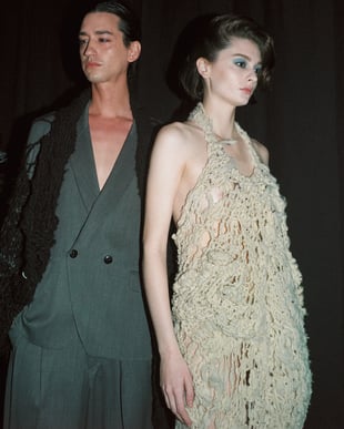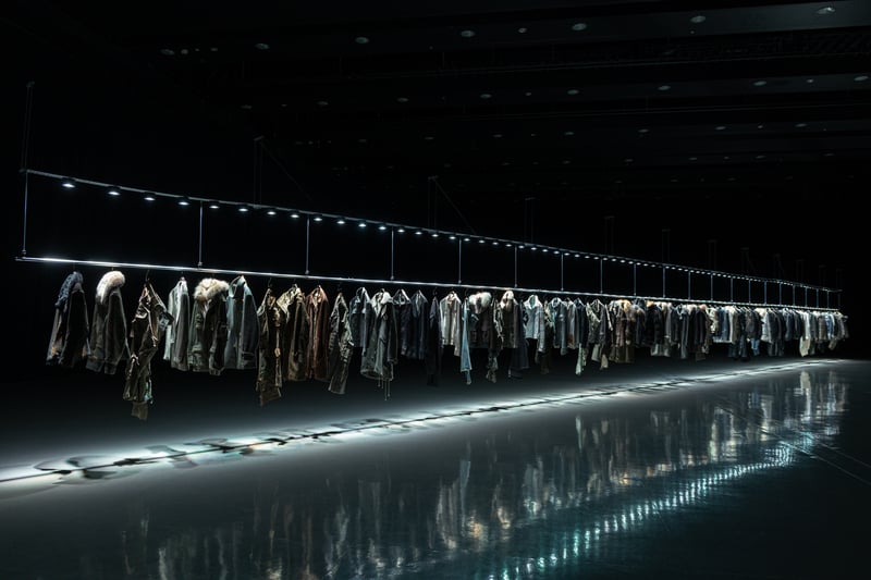 インスタレーションでは、2003年のデビューコレクションから現在に至るまでのアーカイヴ80点を時系列で展示。時代に応じたデザインの変化と同時に、「人間と社会の関係性を布で表現すること」を軸とする連続性を表現した。ベージュのメルトン生地にグレーの顔料を重ねた初期のピーコートや、布帛をニードルパンチで結合したパリ時代のニットジャケット、一時休止を経た2016年の再始動後に発表したネイティブアメリカン風の装飾を施したフライトジャケット、現在のパートではチェーンを織り込みグラフィックを配したデニムジャケットなどを披露。手に取れる距離で服を展示することで、ブランドの持ち味である繊細なディテールにフォーカスし、職人との二人三脚というクリエイションの基盤を提示した。