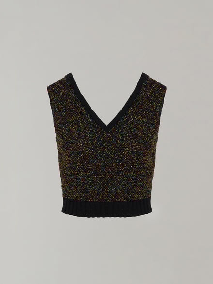 加えて、通常はオンラインストア限定で販売しているブランドのアイコンでもあるガラスビーズの糸で編み立てたハンドニットのプルオーバー「Karachi glass beads handknit vest」(7万9200円)や、4月に発売予定の新柄のグラフィックトートバッグ(3種、3850円)、発売初日に完売となったタビオ(Tabio)とのコラボレーションソックスも用意。また、伊勢丹新宿店別注アイテムとして、「Aura stripe dress」のデニムファブリックモデルも販売する。