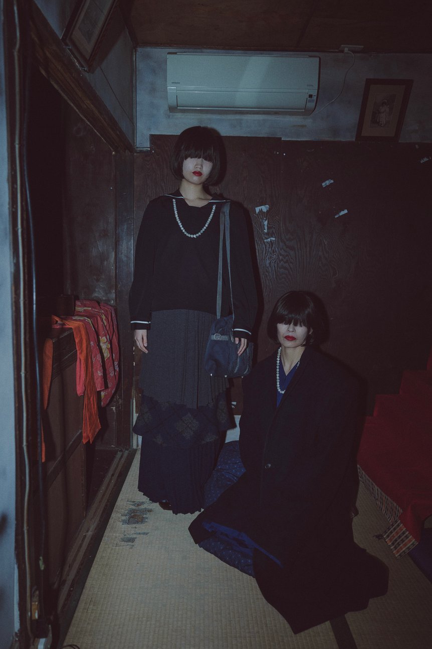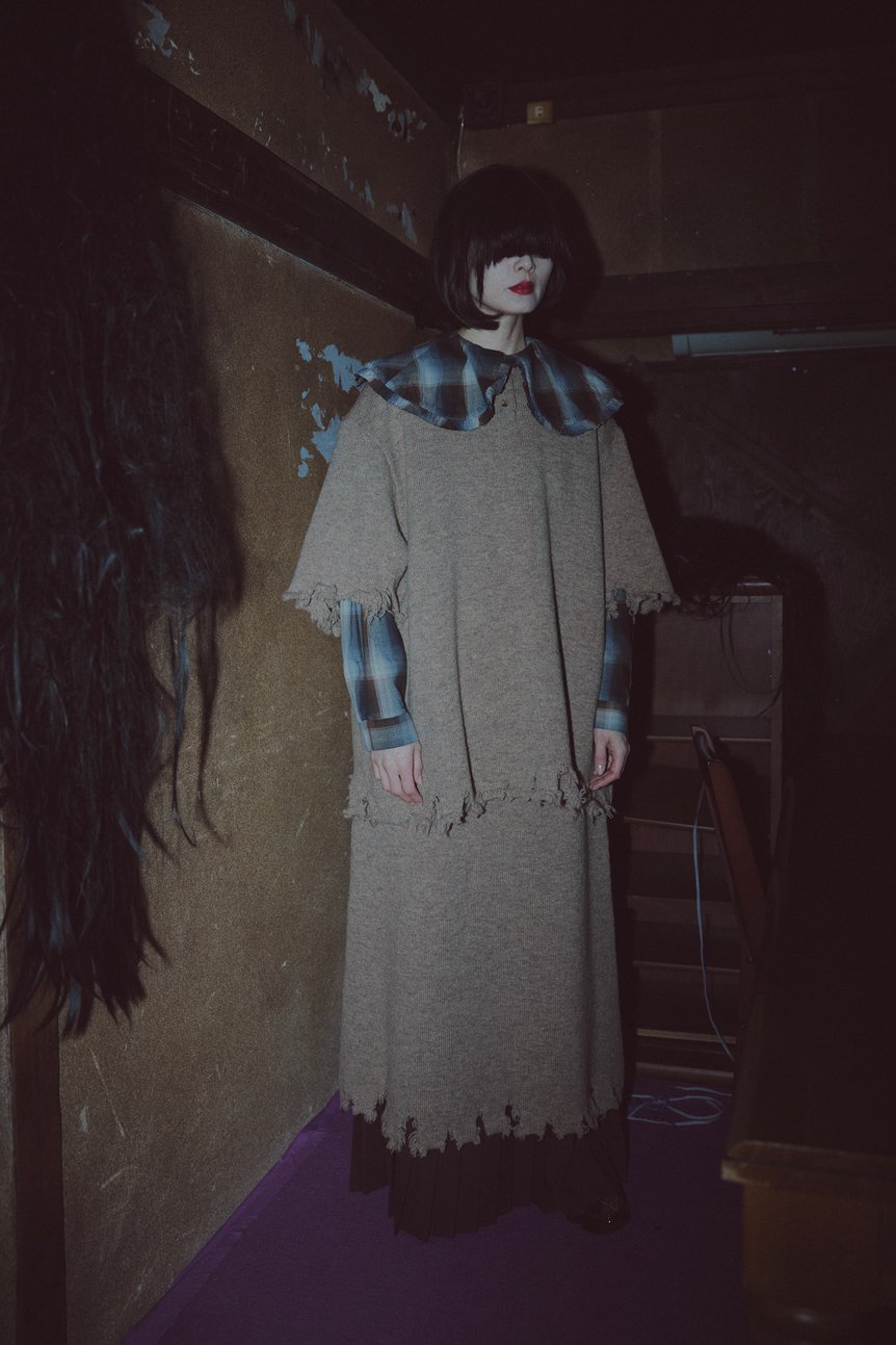 お化け屋敷という性質上、会場は極端に暗く、主役であるはずの衣服のディテールはほとんど見えない。ファッションショーとしては致命的とも言えるこの環境設定も、坂部の計算のうちだ。「服をはっきりと見せることが、自分のやりたいことを伝える最善の方法ではないと感じている」と坂部は明言する。明るい照明下で服の構造を見せるよりも、空間や人を含めた「世界観そのもの」を体感させる方が、結果的に人々の記憶や印象に深く刻まれるという。2026年秋冬コレクションでは、大正・昭和のレトロな要素、着物、昔の女子高生の制服などをミックスし、足元には雪駄のような新作フットウェアを合わせているが、それらの「かわいいテキスタイル」と「不気味な空間」のコントラストこそが、同氏が提示したかったデザインの全体像である。
