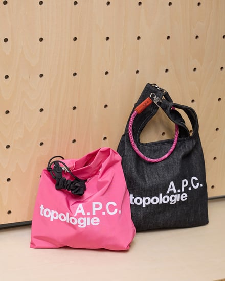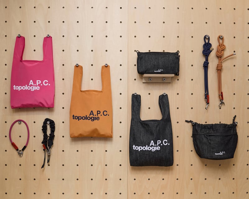 サコッシュ「BOTTLE SACOCHE M A.P.C. TOPOLOGIE」(1万8480円)やバケッドバッグ「REVERSIBLE BUCKET A.P.C. TOPOLOGIE」(1万4300円)、コンパクトなサイズ感の折りたたみバッグ「MINI KONBINI A.P.C. TOPOLOGIE」(7150円)のほか、ストラップ「CORDE BUNGEE A.P.C. TOPOLOGIE」(7480円)などをラインナップする。