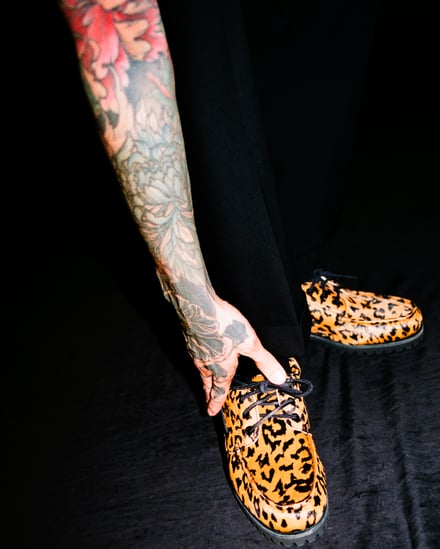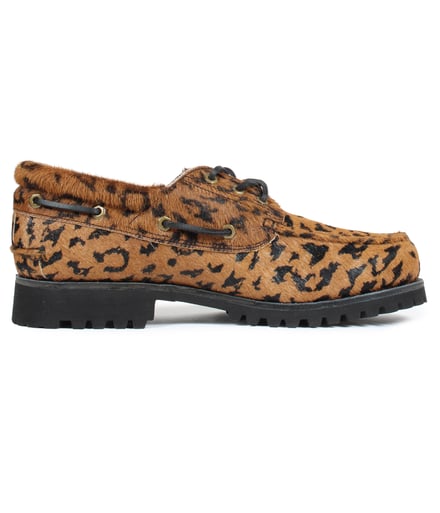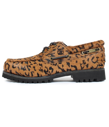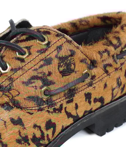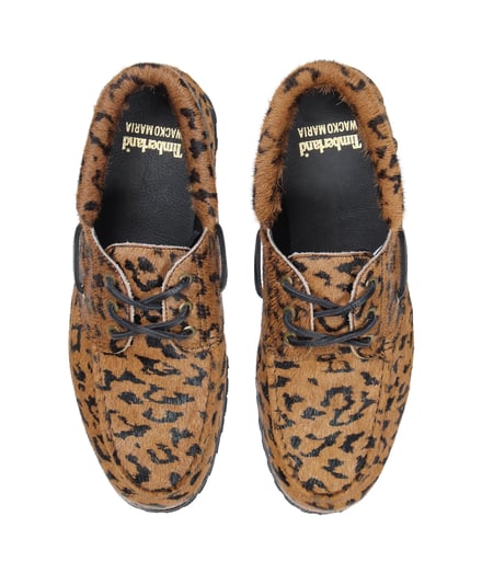 2022年7月以来2度目となる今回のコラボでは、伝統的な手縫いによるモカシン製法や360°レースシステム、ラグソールが特徴のティンバーランドのアイコンモデル「スリーアイクラシックラグ(3eye Classic Lug)」をベースに製作。オリジナルのシルエットはそのままに、アッパーには牛革のハラコ素材にレオパード柄をプリントし、サイドにはブランドロゴを刻印したロゴプレートを配した。ワコマリアオリジナルのレオパード柄を配したブラウンと、ブラックの2色を用意し、価格は3万800円。