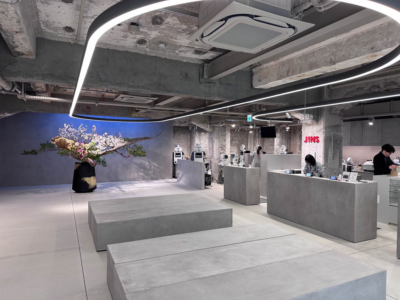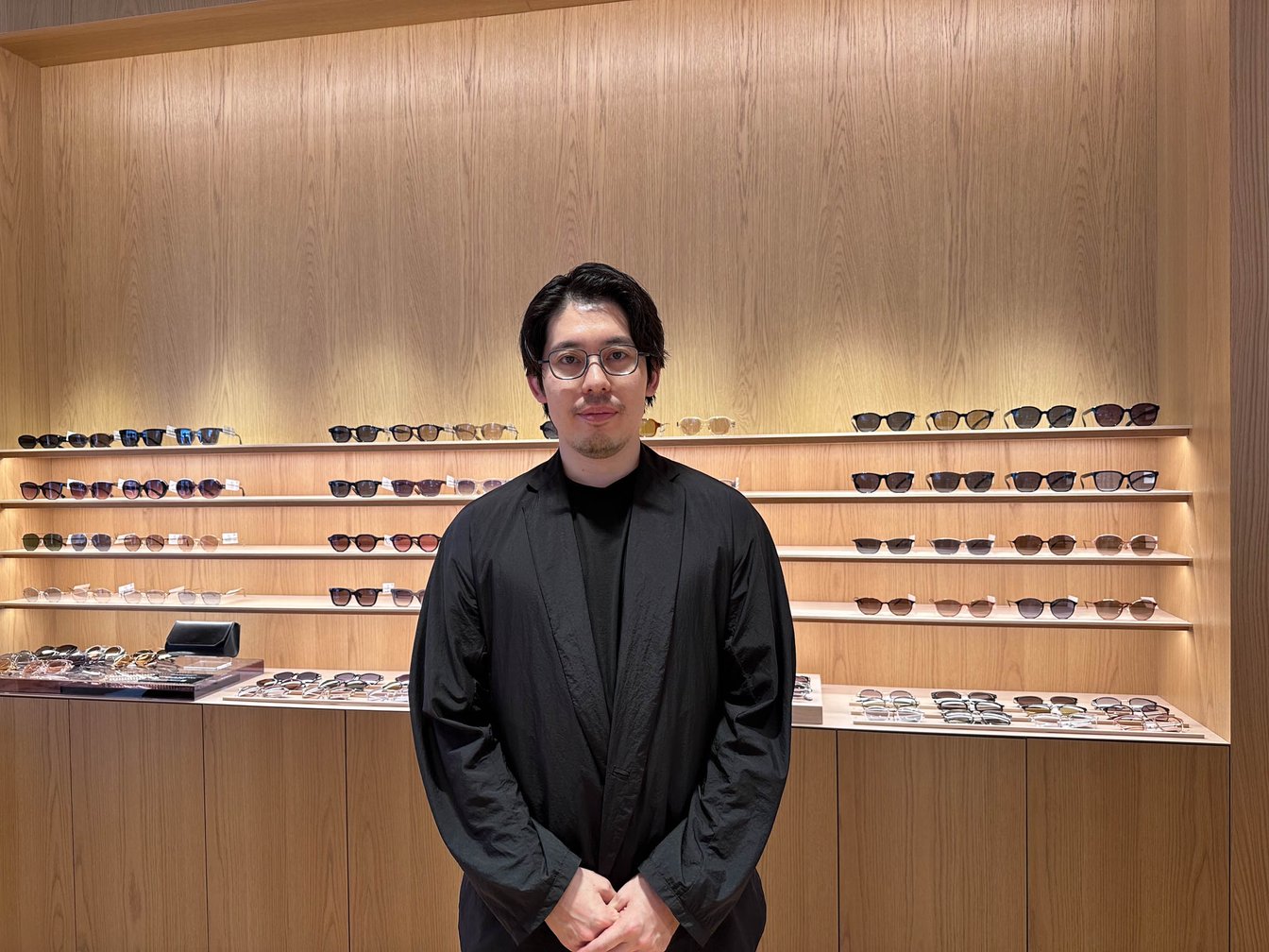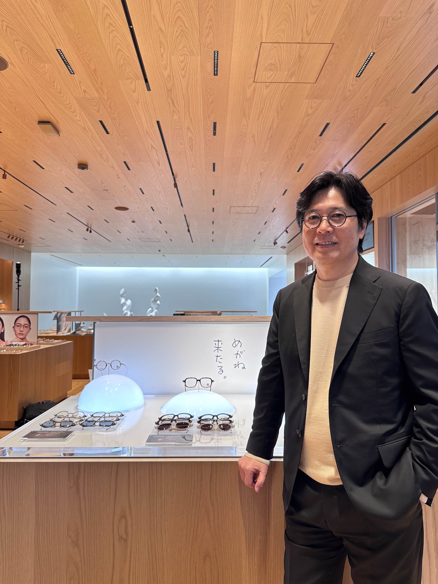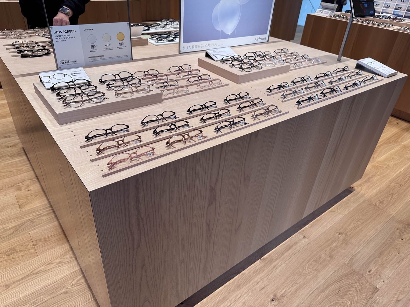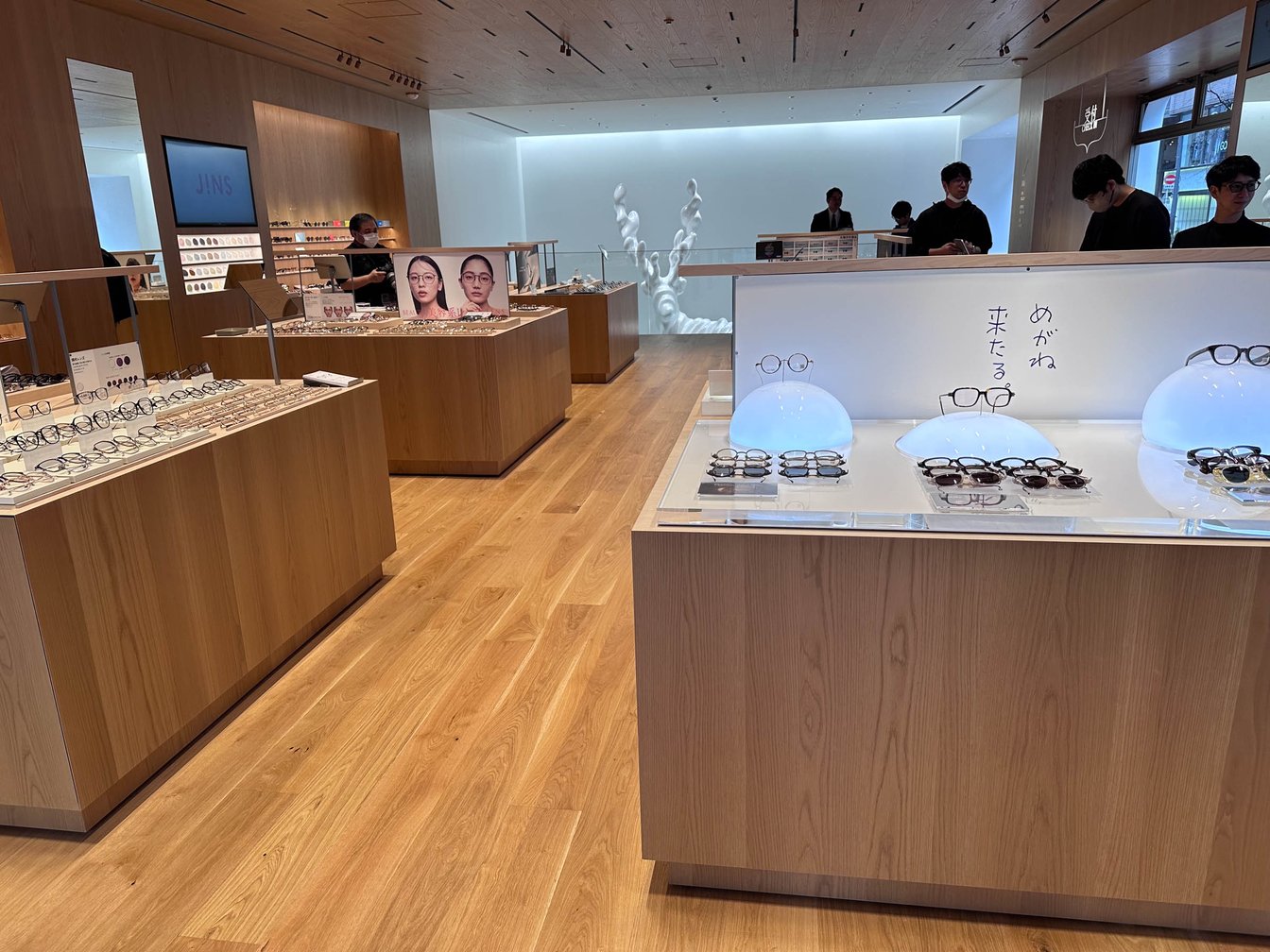 曲線的な外観とは対照的に、店内は直線的な木製の什器で重厚感や静謐な雰囲気を演出している。同社が開発した多言語対応のジンズAIパネルを配置し、新機能「レンズ診断(1分間でおすすめのレンズをレコメンドする機能)」を本格導入。幅広い客層が感覚的に買い物を楽しめるシステムを設計し、創業者田中仁会長のデザインフィロソフィーとグローバル戦略を推進する田中亮社長の多角的な視点が融合した店舗となった。