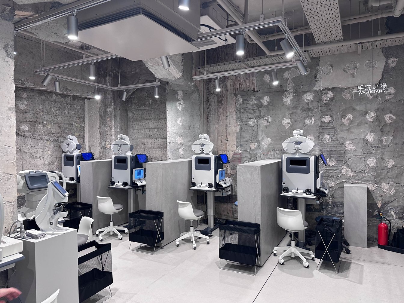 検眼フロアと商品陳列フロアが分かれており、検眼フロアには商品が置かれていないという大胆な空間表現も同店の特徴の一つ。検眼スペースを備える地下フロアは、あえてレーモンド時代の構造を活かした現しで仕上げ、街や建物のルーツとブランドを接続させるイメージを表現した。検眼フロアと逆側の壁面には、完成したメガネを無人で受け取ることができるロッカーを備える。