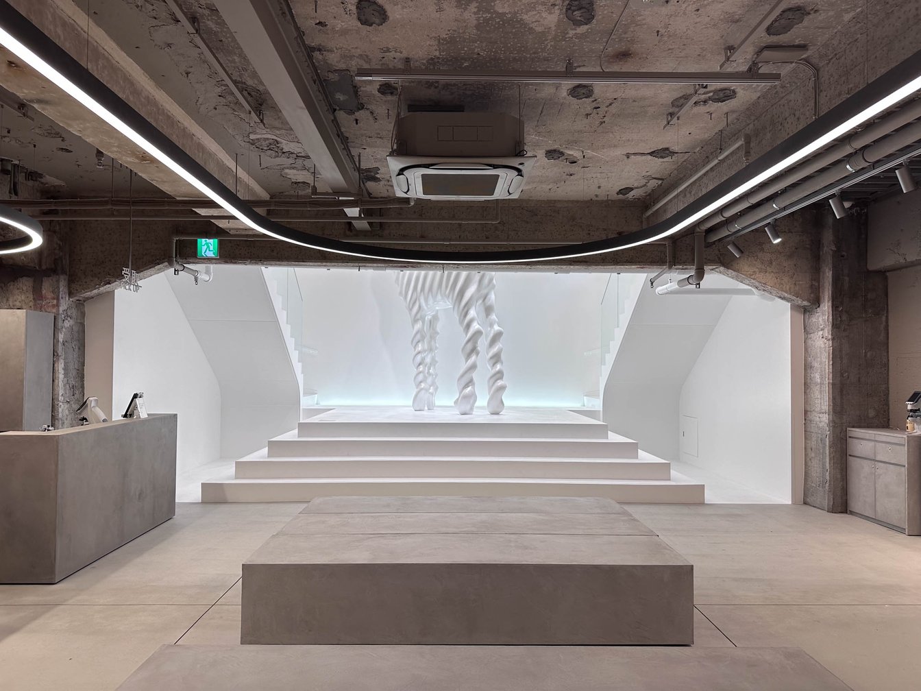 1階と地下1階を繋ぐ吹き抜け空間には、大阪・関西万博のゲート前に展示されたアーティスト 名和晃平の高さ5mの彫刻作品「Snow-Deer」を常設展示。同作は元々名和と親交のあった仁会長が出資したことで制作が実現し、同氏がオーナー権を所有していたことから、同店への設置が決まった。同作の設置が決定してから、急遽内装を変更し、同作に合わせた吹き抜け空間や階段が設計されたという。