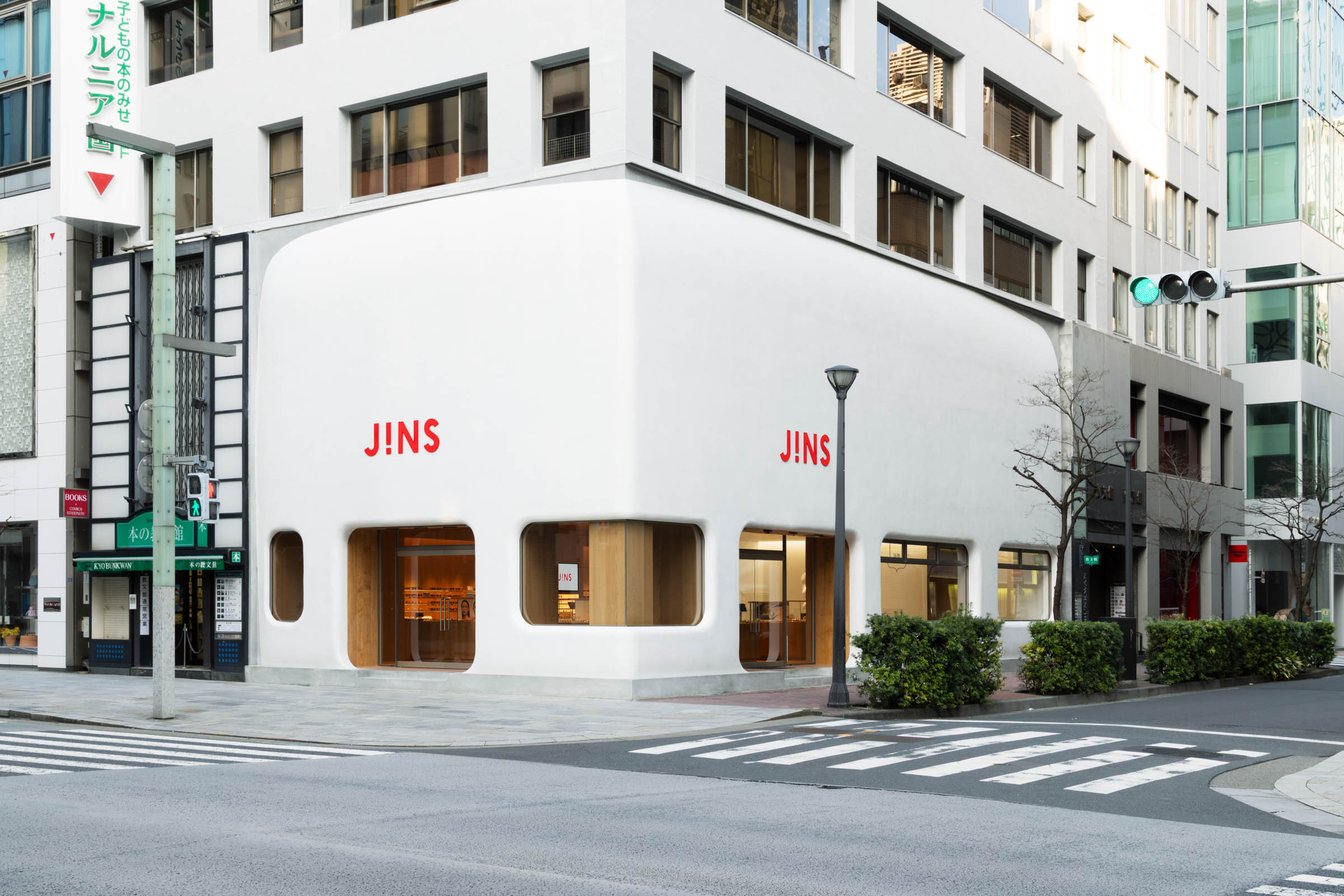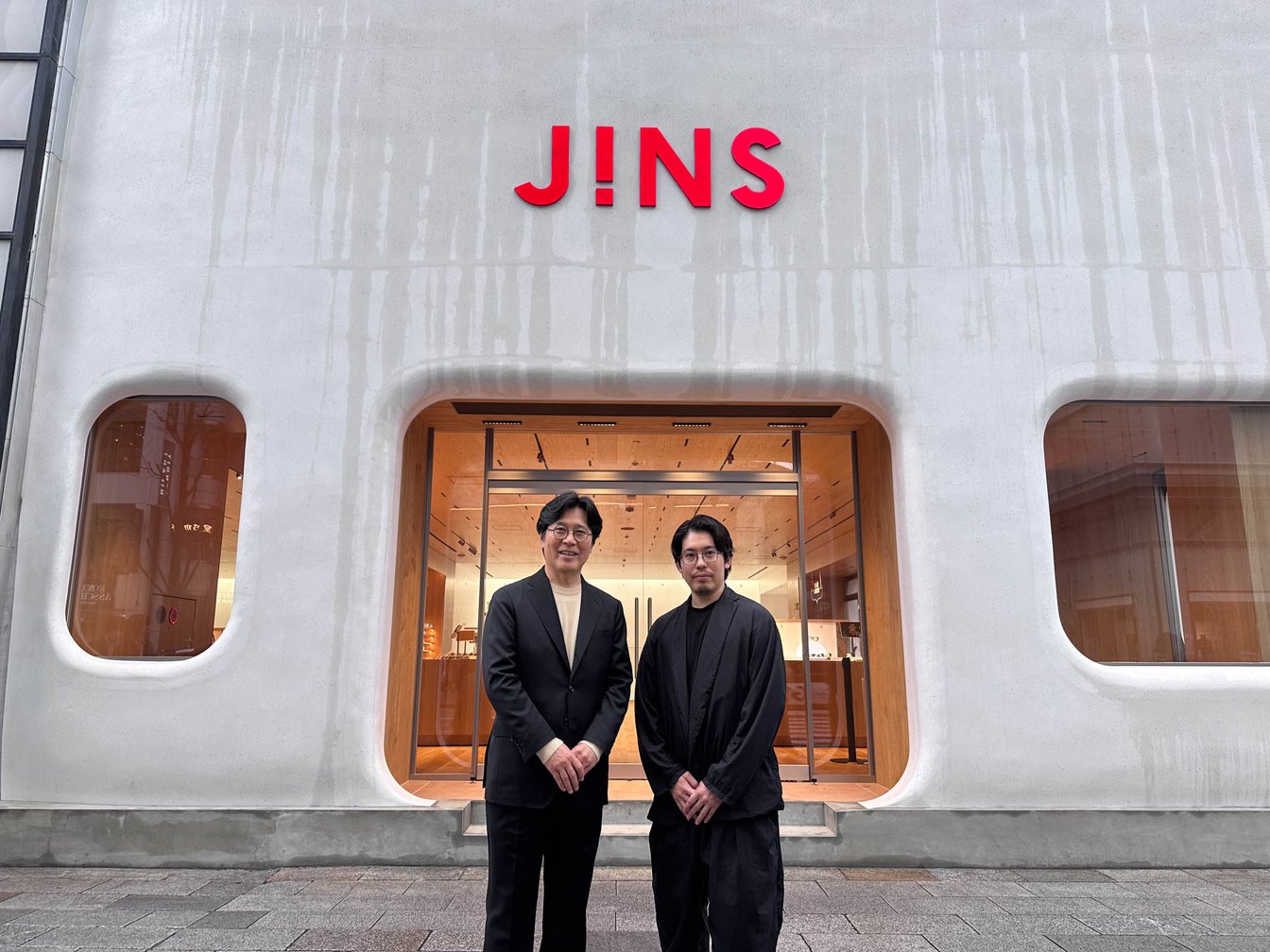 同店は、名だたるブランドの旗艦店が並ぶ銀座・中央通り、銀座3丁目交差点の一角に誕生。近代日本建築の巨匠 アントニン・レーモンド(Antonin Raymond)が手掛けたことで知られる歴史的建築・教文館ビル内で、田中仁会長が10年以上前から「銀座に出店するならこの場所が良い」と語っていた念願の区画だったという。ラグジュアリーブランドや外資系ブランドが並ぶ同エリアに、カジュアルアイウェアブランドであるジンズが出店するハードルは高かったという。同テナントが空くかもしれないという話を耳にした仁会長は、アントニン・レーモンドの弟子で前川國男の弟子にあたる建築家 横内敏人に前橋の自邸の設計を依頼した過去がある縁など、同エリアへの熱い想いをまとめた冊子とともに教文館の森岡新社長と交渉を重ね、出店が実現したという。