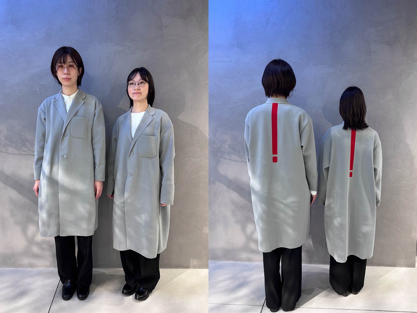 同店限定のスタッフユニフォームであるグレーのロングジャケットは、デザイナーの高橋悠介が手掛ける「シーエフシーエル(CFCL)」が制作。ジンズが銀座店にかける想いや「縁(えにし)」という同店のコンセプトを踏まえ、医療機器として求められる信頼性とジンズが持つ親しみのバランスを考慮し、空間の色調とマッチするグレーカラーを採用した。背面にはジンズのロゴにも含まれている「!」があしらわれ、CFCLならではのニット素材が温かみを感じさせる。銀座から日本発のアイウェアブランドとして世界へ発信していくにあたり、日本発の若手ブランドとして高いサステナビリティを掲げて世界で活躍するCFCLの価値観に共感したことから起用に至った。