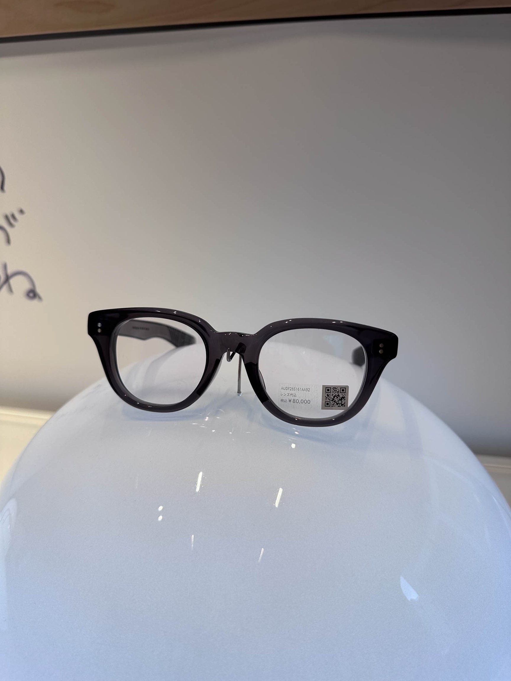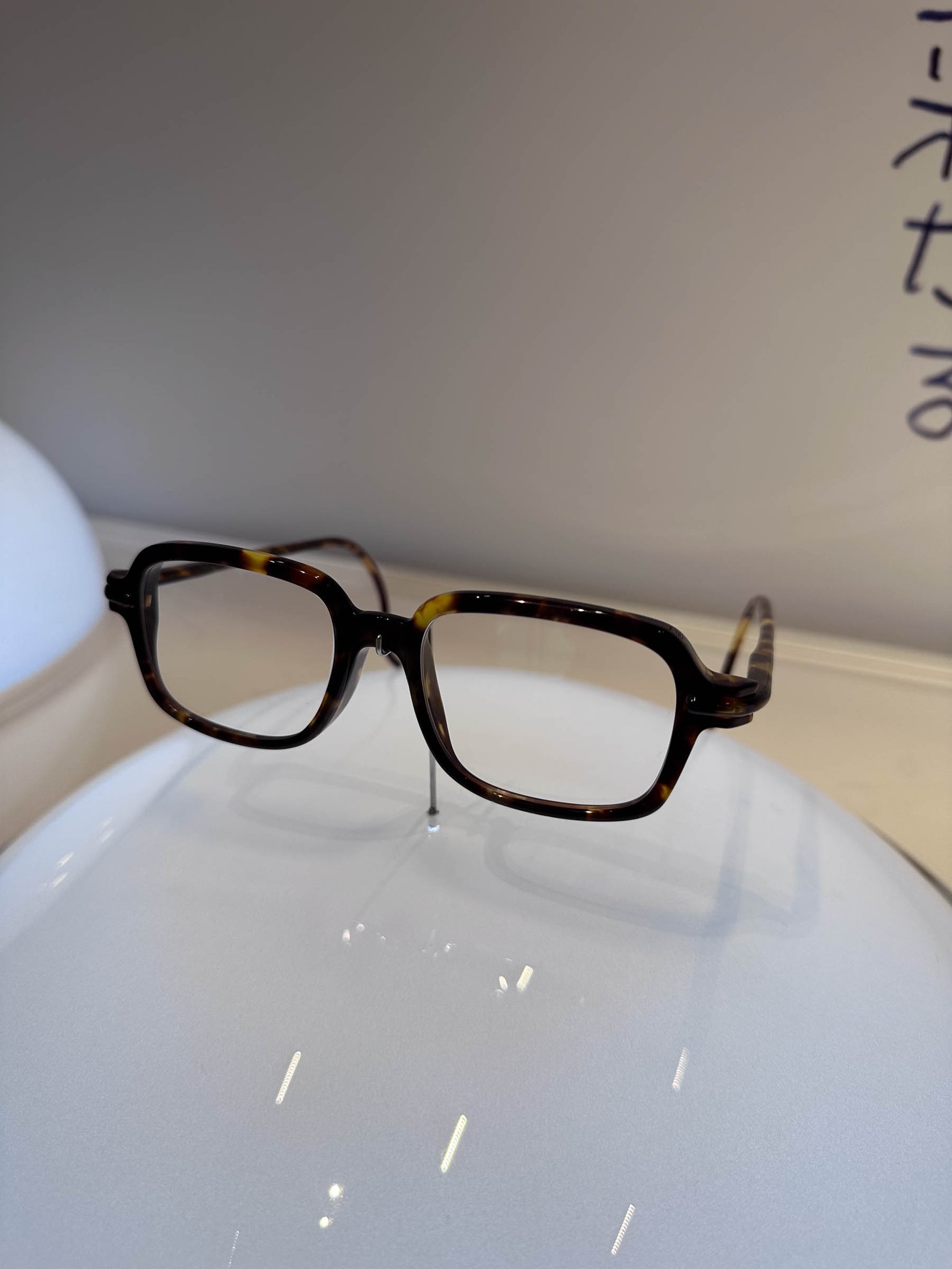 田中亮社長が着用しているのは銀座店限定チタンフレームのウェリントンタイプをクリアレンズに交換したもの