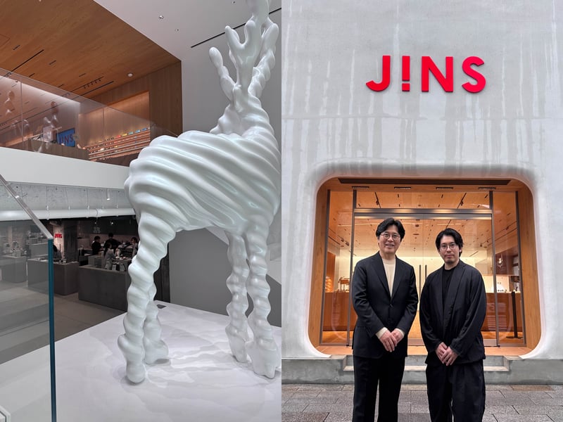 アイウェアブランド「ジンズ(JINS)」の初のグローバル旗艦店「JINS銀座店」が、3月28日にオープンする。オープンに先駆け、メディアと一部関係者向けに全貌を公開。ジンズの創業者である田中仁会長と田中亮社長が取材に応じ、店舗設計を手掛けた建築家の藤本壮介と店内に常設される彫刻作品の作者である彫刻家の名和晃平、田中仁会長が登壇したトークイベントでは、それぞれの立場から店舗づくりに込めた想いやエピソードが語られた。