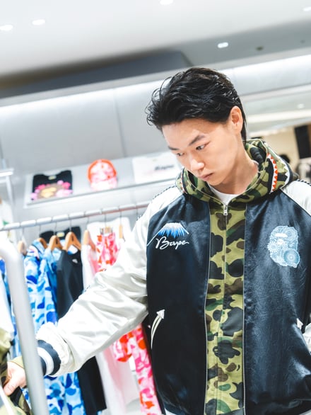 「ア ベイシング エイプ®(A BATHING APE®)」が、3月25日に新ストア「BAPE STORE® HANKYU MENʼS OSAKA」を阪急メンズ⼤阪にオープンした。初日には俳優の笠松将がいち早く来店し、ブランドの世界観を体現するこだわりの店舗空間でショッピングを楽しんだ。
