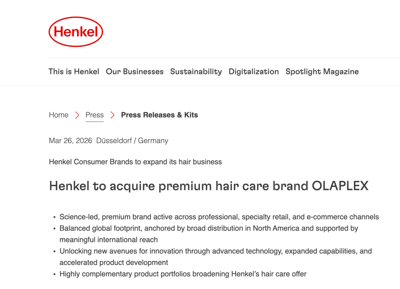 独のヘンケル(Henkel)が、ヘアケアブランド「オラプレックス(OLAPLEX)」を買収した。買収価格は1株あたり2.06米ドルで、オラプレックス株式100%を取得することで合意。同社はこれを戦略的投資の一環と位置付け、コンシューマーブランド部門におけるヘアケア事業、とりわけプレミアムおよびプロフェッショナル市場での成長加速を狙う。