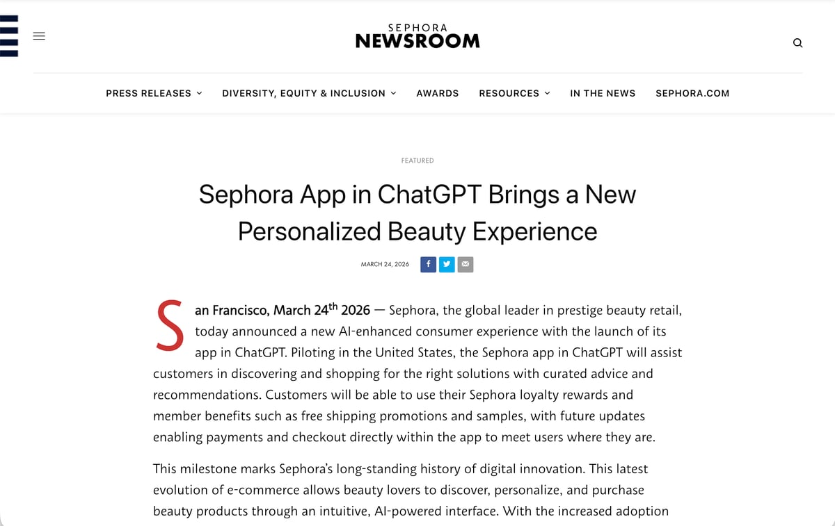 LVMHモエ・ヘネシー・ルイ・ヴィトン傘下の化粧品小売店「セフォラ(SEPHORA)」が、対話型AIのChatGPT上でアプリをリリースし、米国市場で試験的に導入する。AIを活用したサービスで新たな顧客体験を提案する。