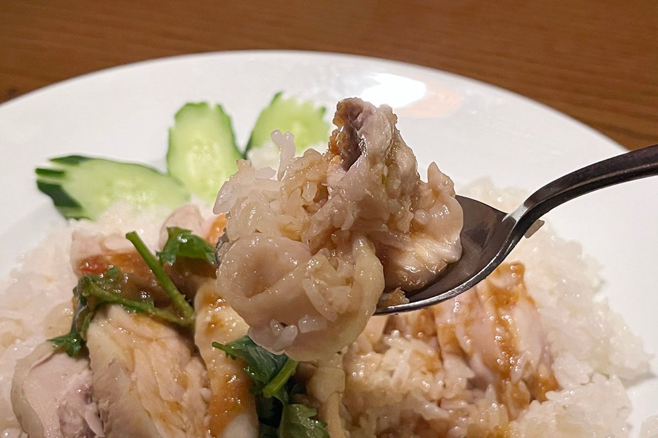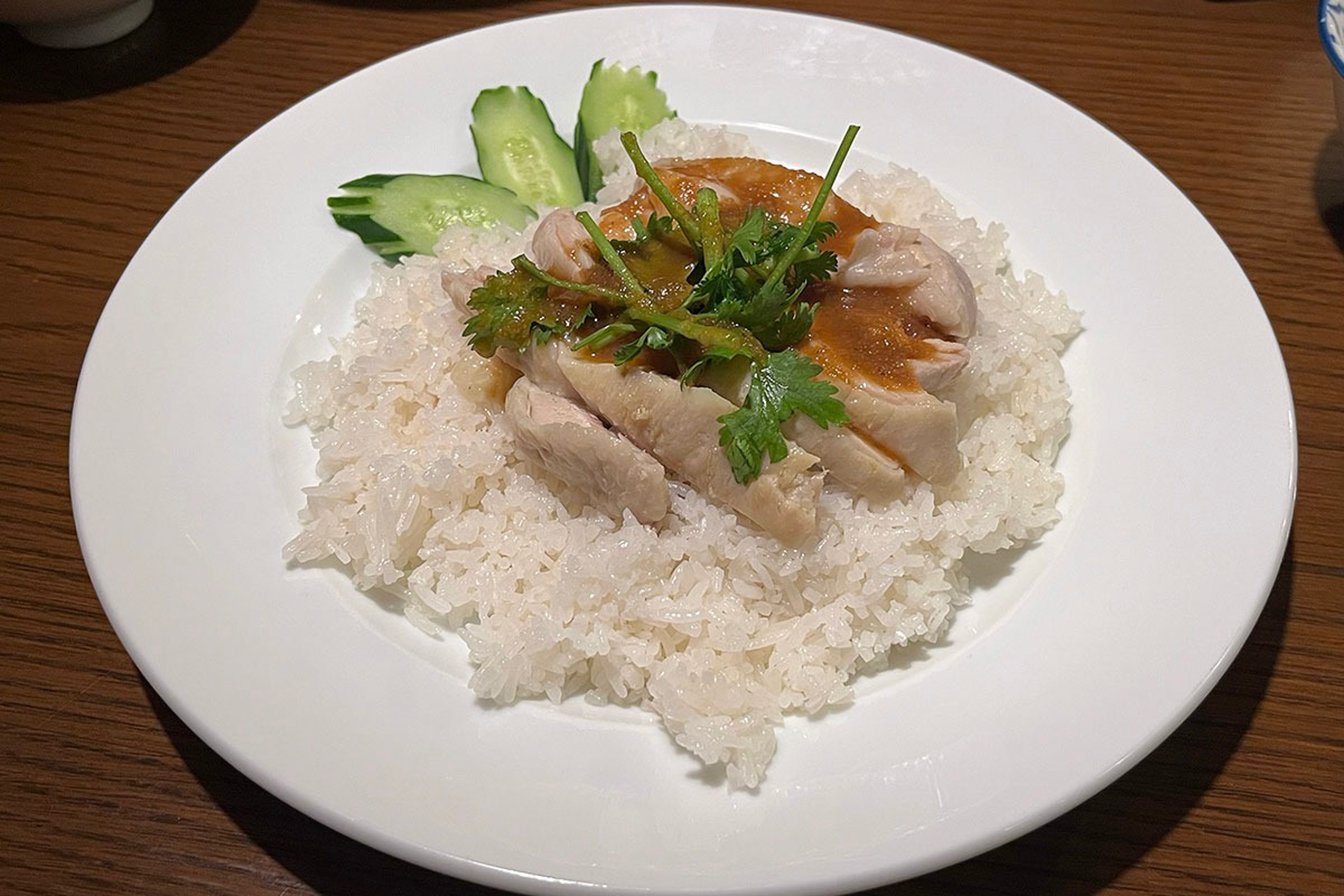 編集部員がオーダーしたタイのチキンライス。いわゆるカオマンガイ・海南鶏飯的なメニュー。違いはタレということで大豆の発酵味噌「タオチオ」にニンニク、生姜、唐辛子を混ぜた、濃厚で甘辛いタレがタイのカオマンガイになる。