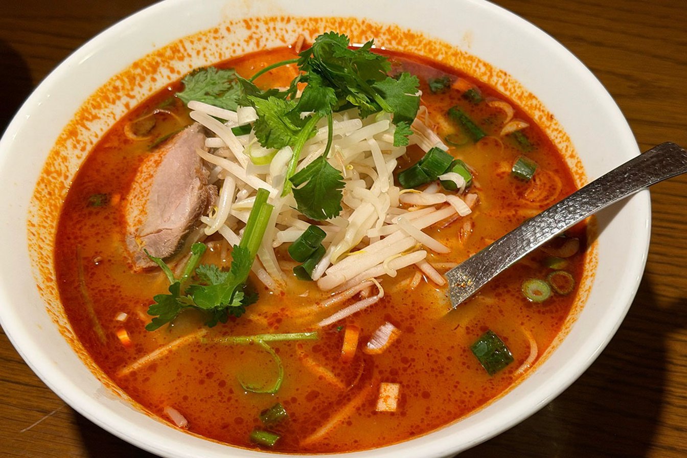 そしてもう一人の編集部員は「トムヤムラーメン」。タイ料理はおいしいとあらためて認識させてくれたお気に入りのメニューなんだとか。麺の種類も選べるが中華麺をセレクト!酸味とコクのある辛味スープにツルツル麺が絡んでこちらも絶品。添えられたチャーシューも旨味たっぷりでおいしい!