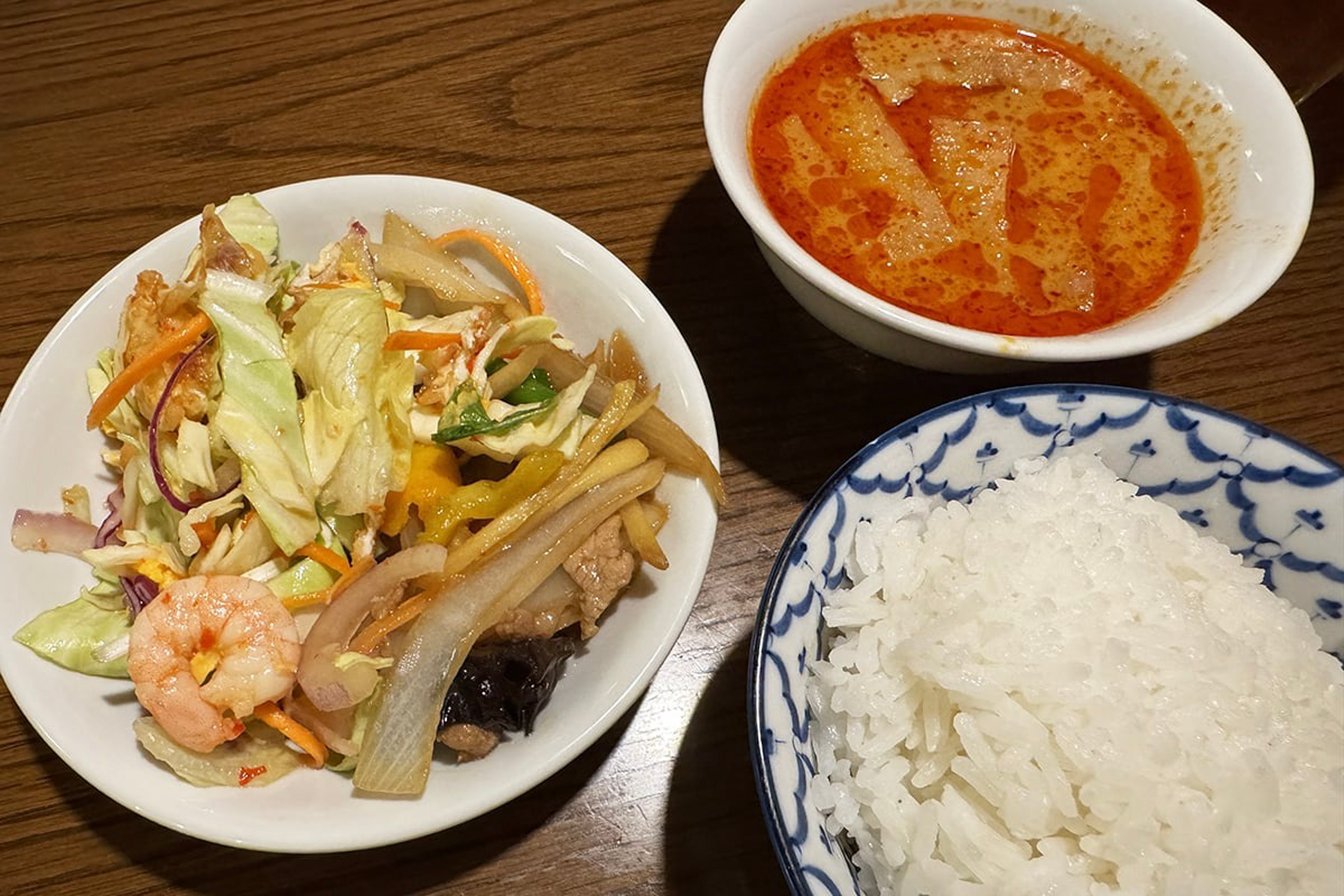 メインのガパオライスがあるのに、カレーまで食べ放題とは、太っ腹すぎる。メイン料理とビュッフェのお惣菜を少しずつお皿に盛れば、自分だけの豪華なタイ料理プレートが完成。スパイスと旨みの波状攻撃に、胃袋も心も大満足だ。