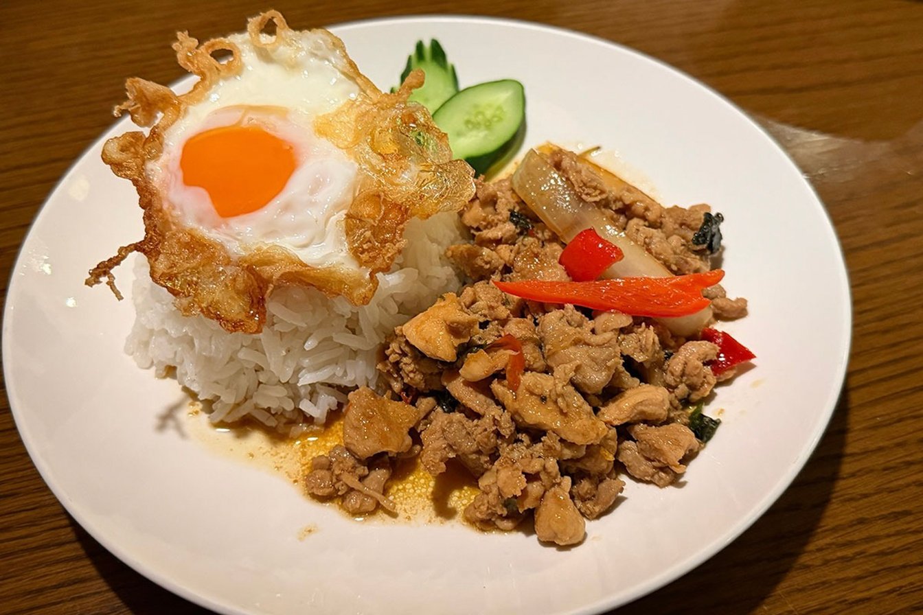 やってきたガパオライスは、粗挽きのひき肉にバジルとパクチーの香りがガツンと効いた本格派。辛さはマイルドでありながらも、スパイスの奥行きがしっかり感じられ、ご飯が進んで仕方がない。とろとろの目玉焼きを崩して絡めれば、もうスプーンが止まらないおいしさだ。