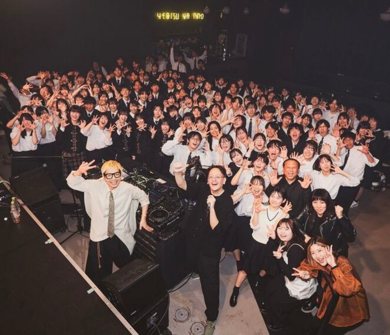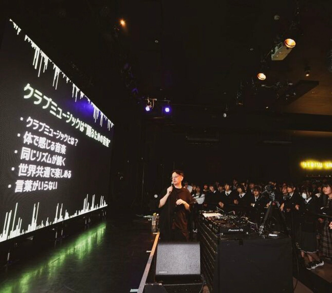 生徒たちは、実際に機材に触れながら曲をつなぐ体験にも挑戦しました。講義後のDJタイムでは、制服姿の高校生たちがMCに歓声で応えながら飛び跳ね、夢中で踊る場面も。フロアは沸き立つような熱気に満ちていました。