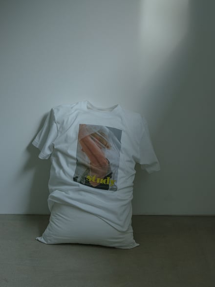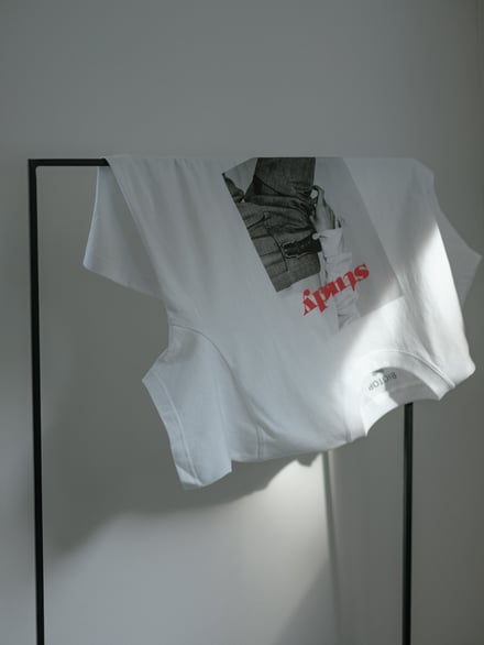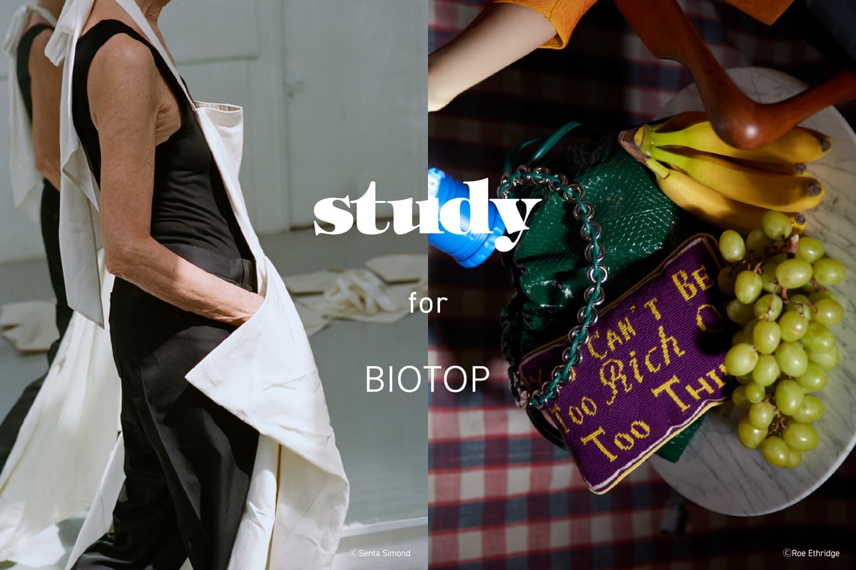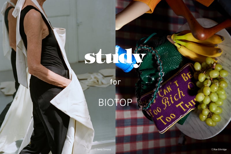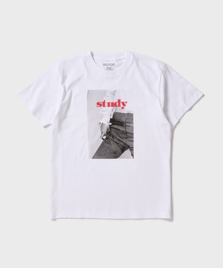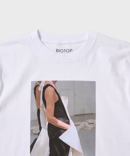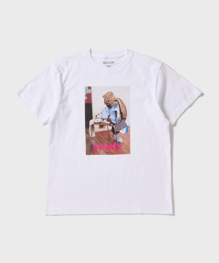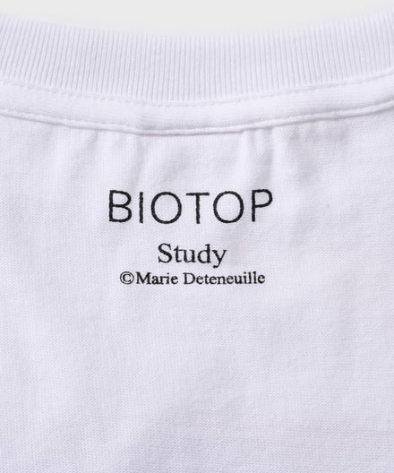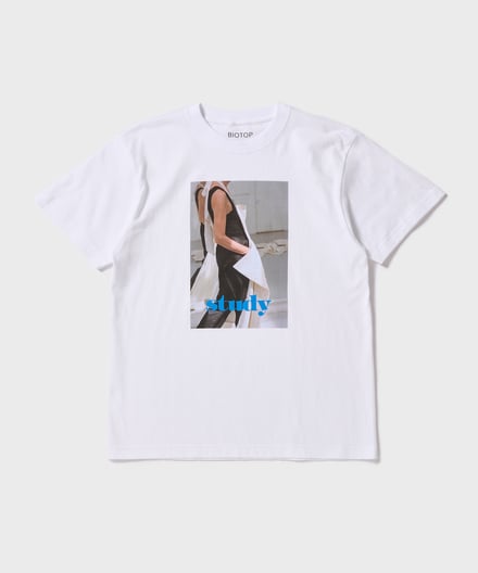 コラボでは、スタディvol.10〜12に掲載されたヴィジュアルをあしらった計5デザインを揃える。Vol.10からは写真家ロー・エスリッジ(Roe Ethridge)が撮影した1枚を、Vol.11からはマリー・デトヌイユ(Marie Deteneuille)、Vol.12からはセンタ・サイモンド(Senta Simond)が撮影した2枚をそれぞれピックアップし、Tシャツのフロントにプリント。背面には、「BIOTOP」と「Study」のロゴを配した。いずれもカラーはホワイトで、価格は7920円。