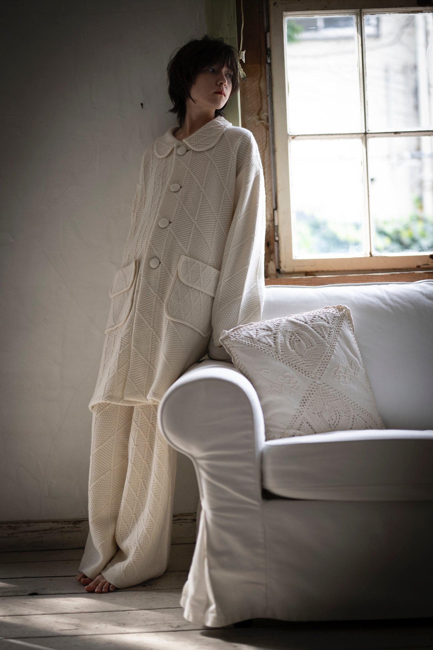 なかでもブランドを象徴するのは、「ザ・ホールシリーズ(THE HOLE SERIES)」と名付けた穴の開いたニット群だ。胸元や背中に大きな穴がデザインされたニットトップスや、全体にアイレットが散りばめられたニットドレスには、「未完成であることの美しさ」や「本来の自然な姿であること」を肯定する意図が込められている。