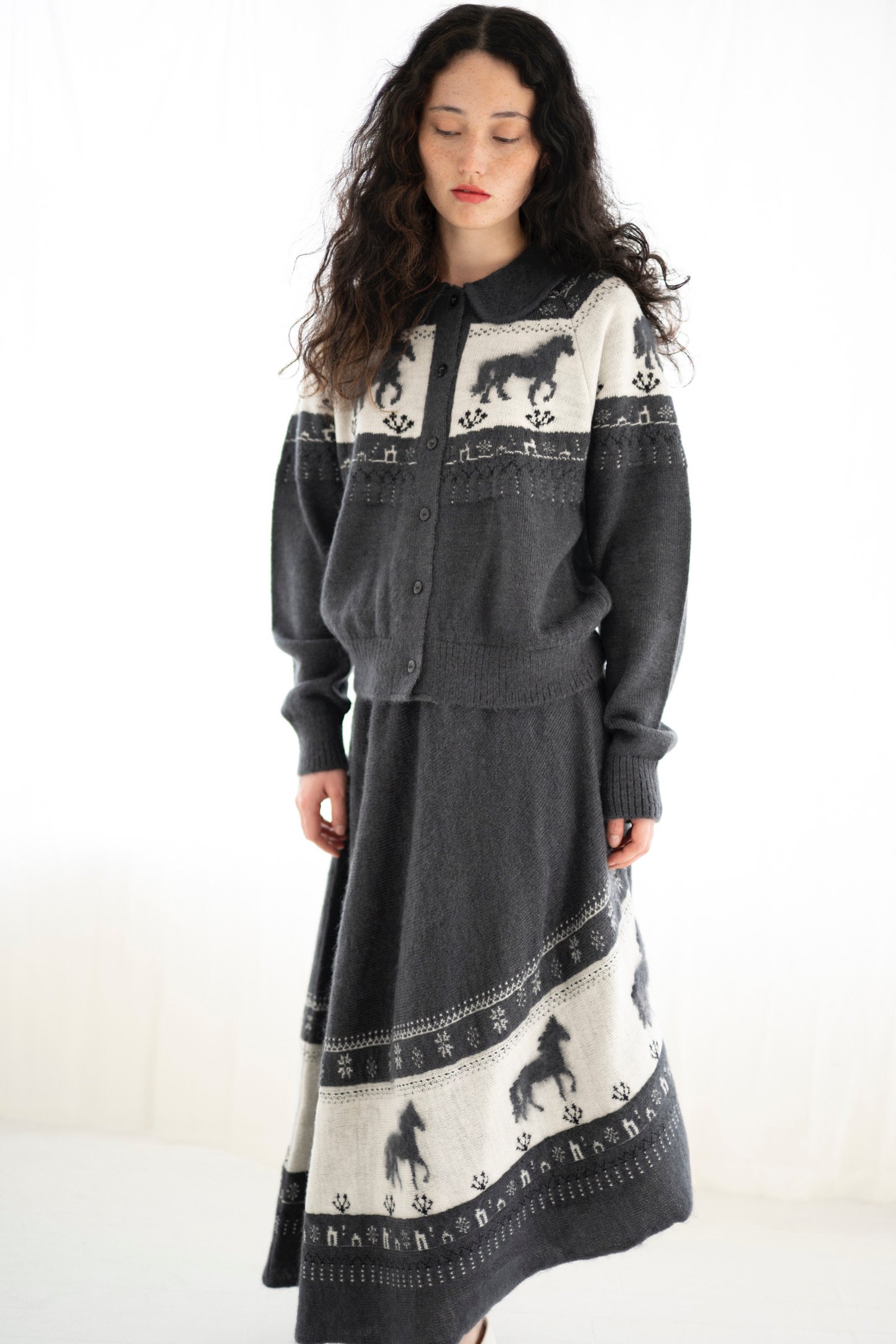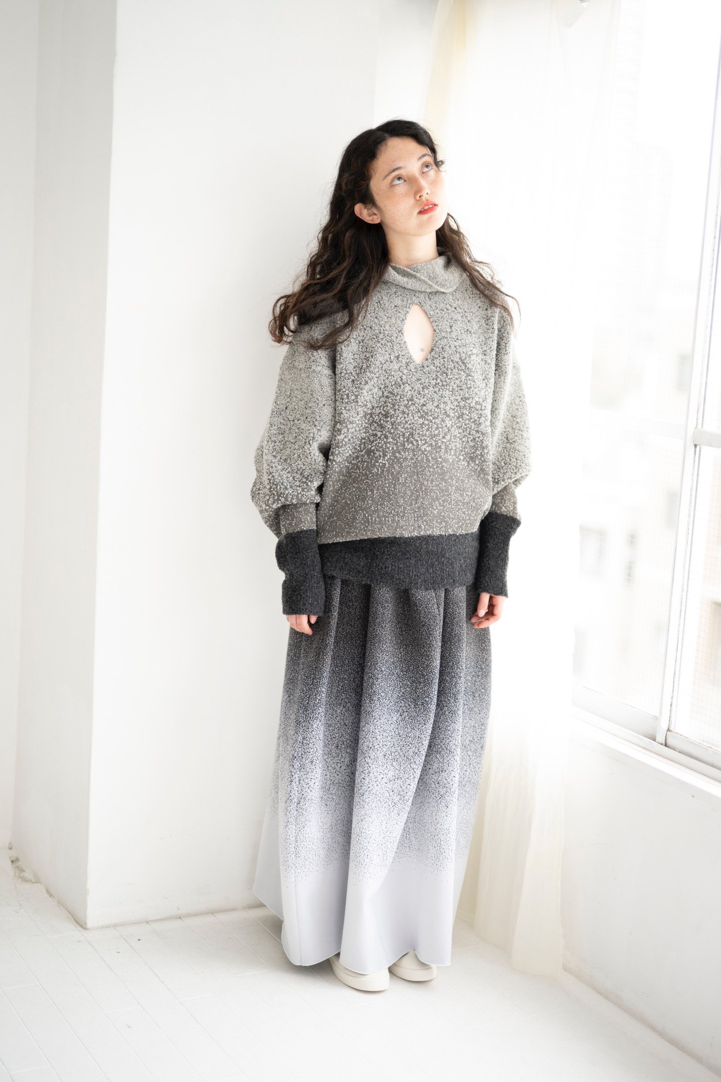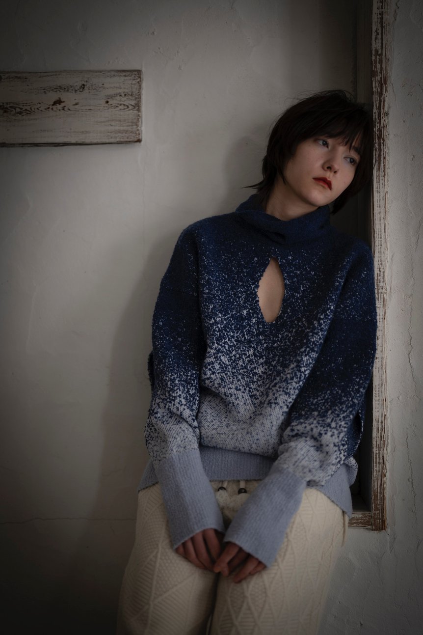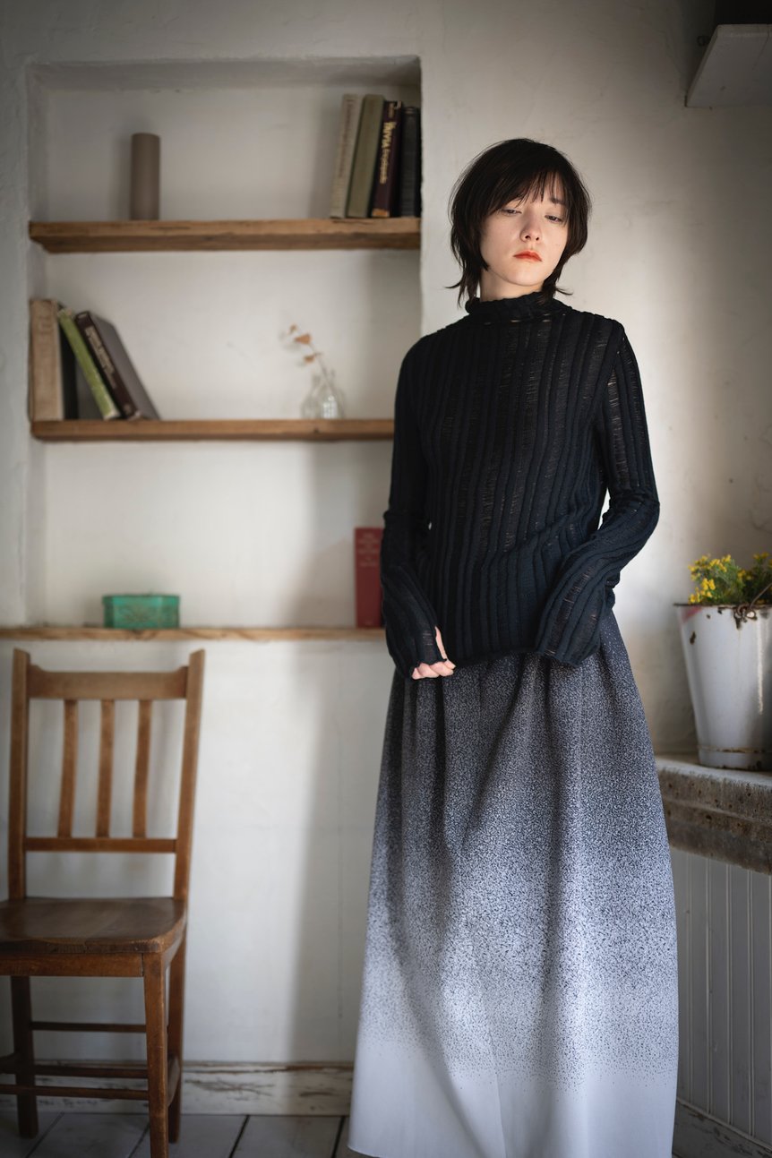 ファーストコレクションのテーマは、「Returning to Nature(自然への帰路)」。東京から自然豊かな新潟に拠点を移した自身の環境の変化を、グラデーションやアシンメトリーのデザインに表現。左右で編み柄のスケールが異なるニットコートやパンツ、点描画のような4色のジャカードがグラデーションを描くプルオーバーニットやスカートなどに落とし込んだ。