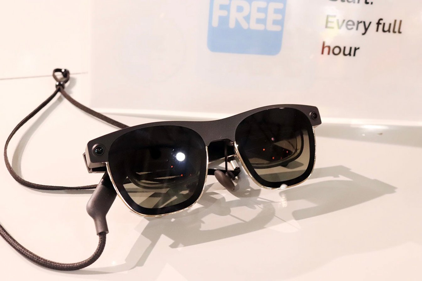 こちらがXREAL社の最新ARスマートグラス。ファッショナブルなデザインが特徴のXREAL社のARスマートグラスだが、あらためて実機を見るとデバイス感が極力排除され、デイリーで使うサングラスのような印象だ。テンプルあたりにスピーカーが付いていて音声を聞くことが可能。