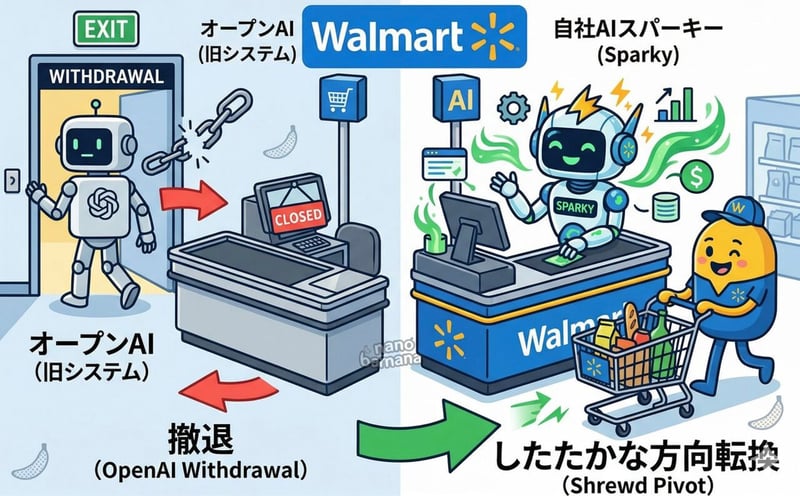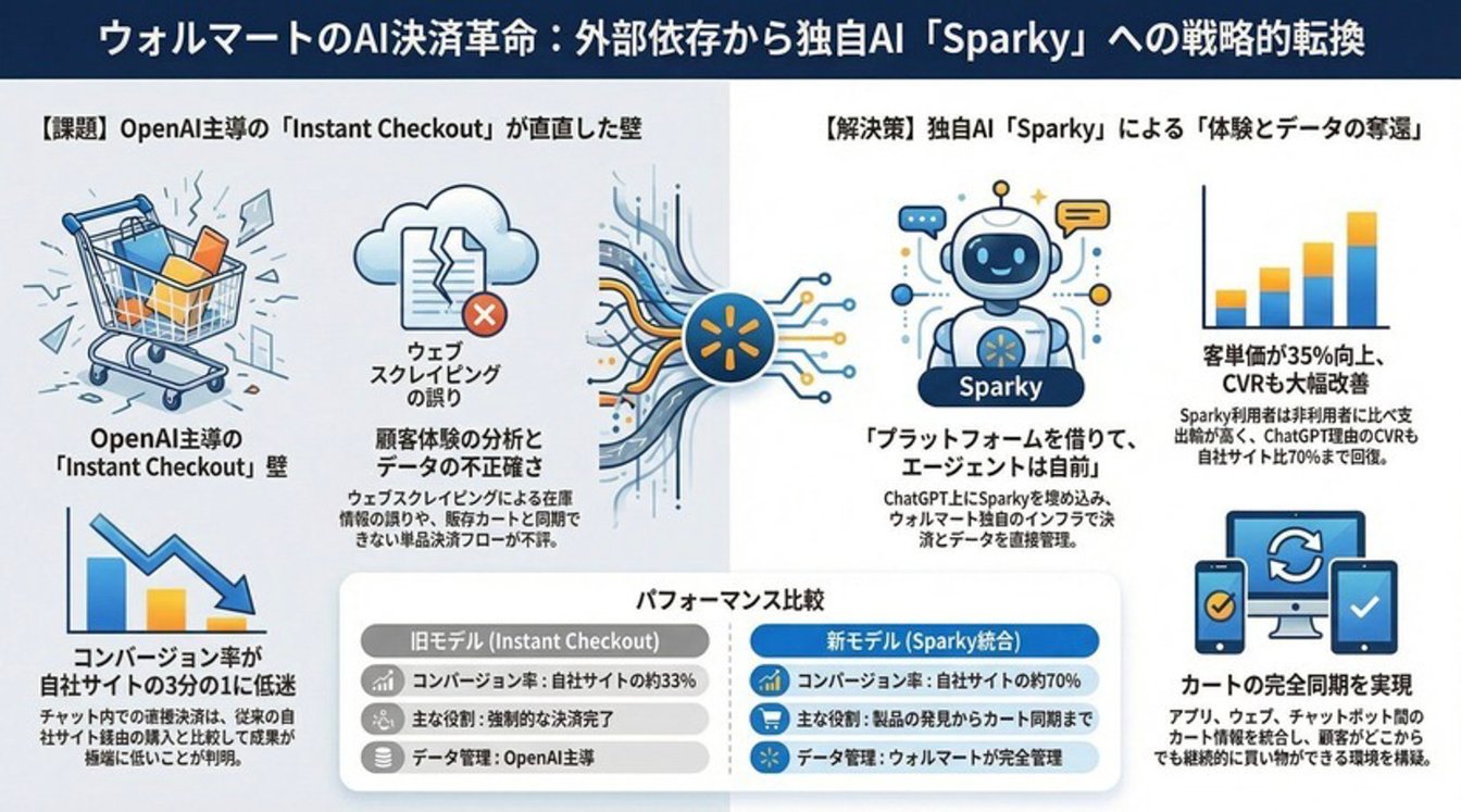 しかし、ウォルマートはここからが見事でした。決済インフラをオープンAIに任せるのをやめ、自社のAIアシスタント「スパーキー」をチャットGPTの内部に直接埋め込む戦略へ大転換したのです。