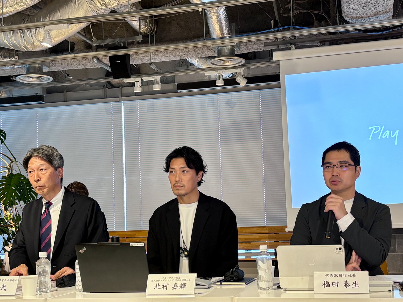 3月からの新経営体制の核となる3人。右から福田アンドエスティHD新社長、北村嘉輝アダストリア社長(5月にアンドエスティHD専務にも就任予定)、林正武アンドエスティHDグループ執行役員経営企画本部長(5月に取締役就任予定)