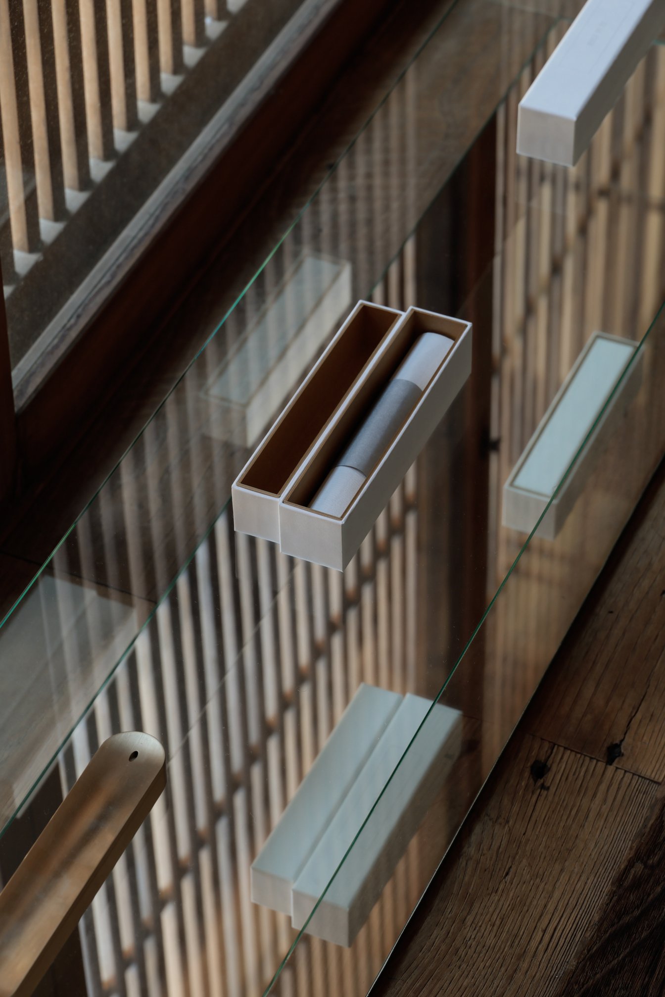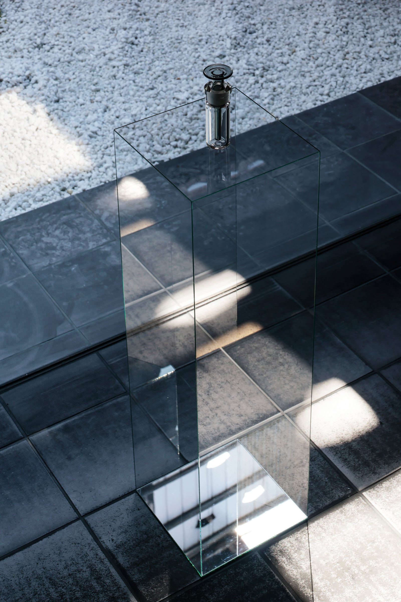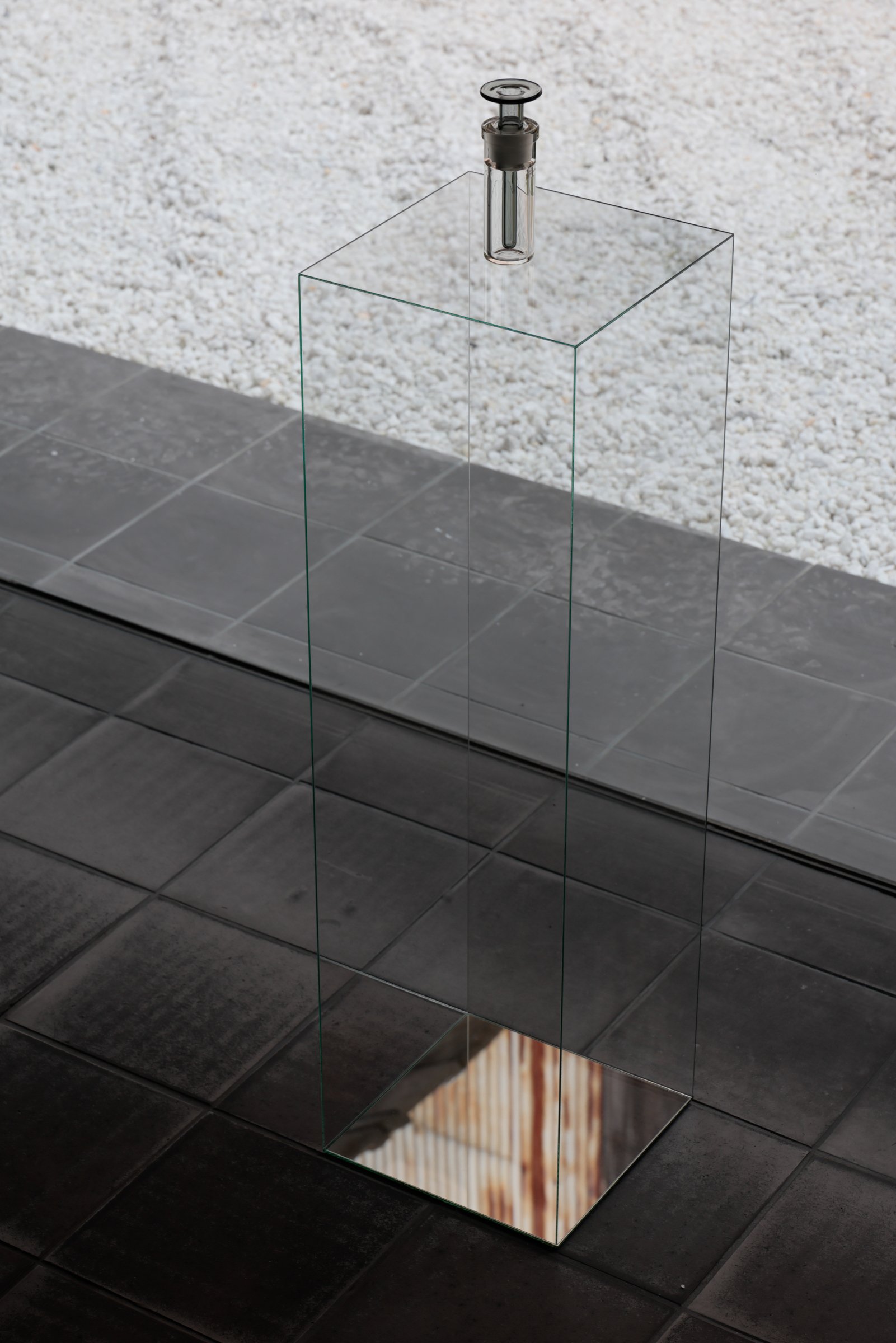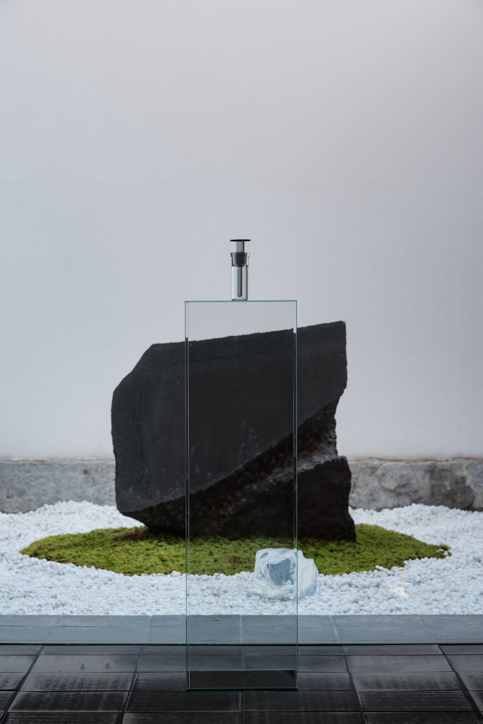 祇園の総合芸術空間「T.T」では、両足院での展覧会に呼応するガラスと鏡を用いたインスタレーション「月面の光(こう)」を同時開催。三保谷硝子店が手掛けた、極限まで薄く作られたガラス什器の上に香水とお香が設置されている。光の反射によっては何も見えない中に香りだけが存在し漂う様子は、月面の閃光現象と同様、ただ反射し漂い、消えていくという「空虚」を体現したものとなっている。なお、香水とお香は現在同店で販売している。