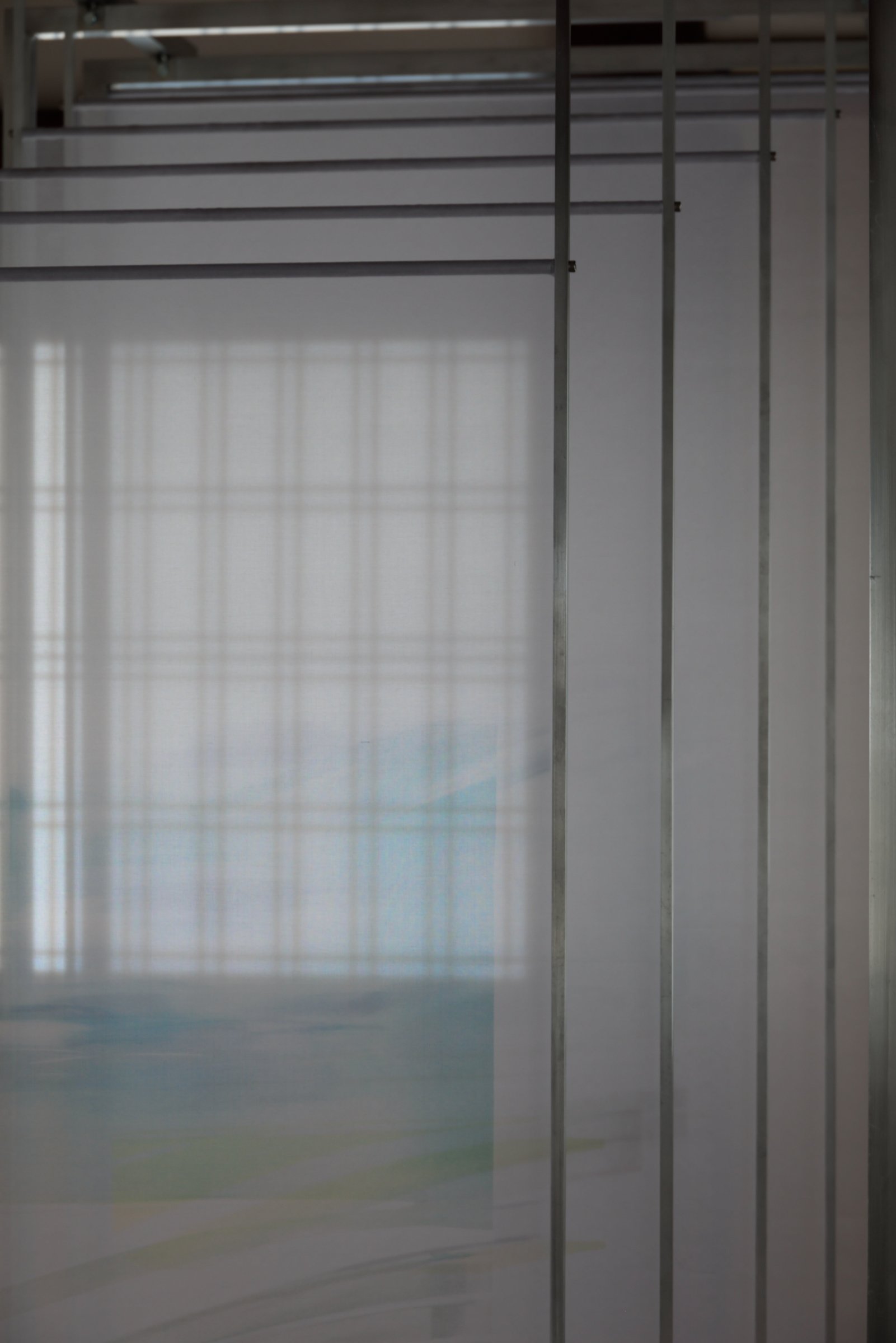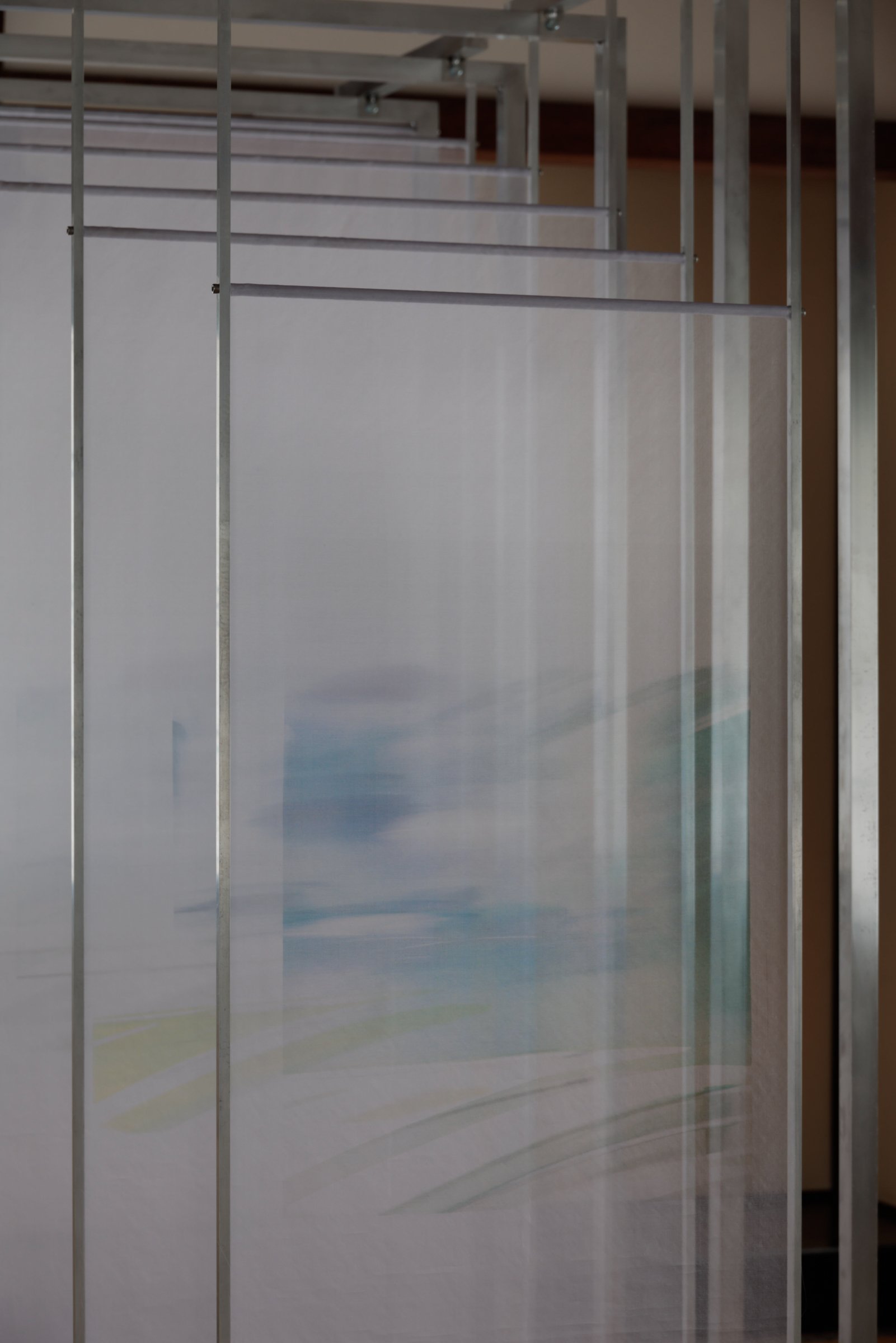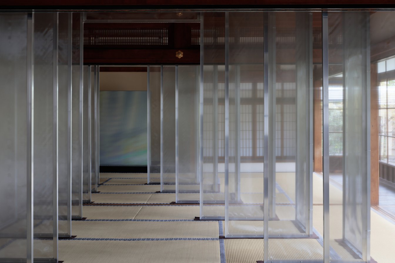「大書院」では、オーガンジー素材にメタルプリントを施した銀色の布を貼ったパネルが襖のように連続的に配置されている。鑑賞者がその間を移動する際、布の表面は光や鑑賞者の身体の動きに応じて変化するとともに、布には今回のコラボで制作した香りが焚きしめられている。嗅覚を通じて“かつて存在した煙の痕跡”を感じることで、「存在」と「不在」の関係性や立ち現れ方を体感することができる。