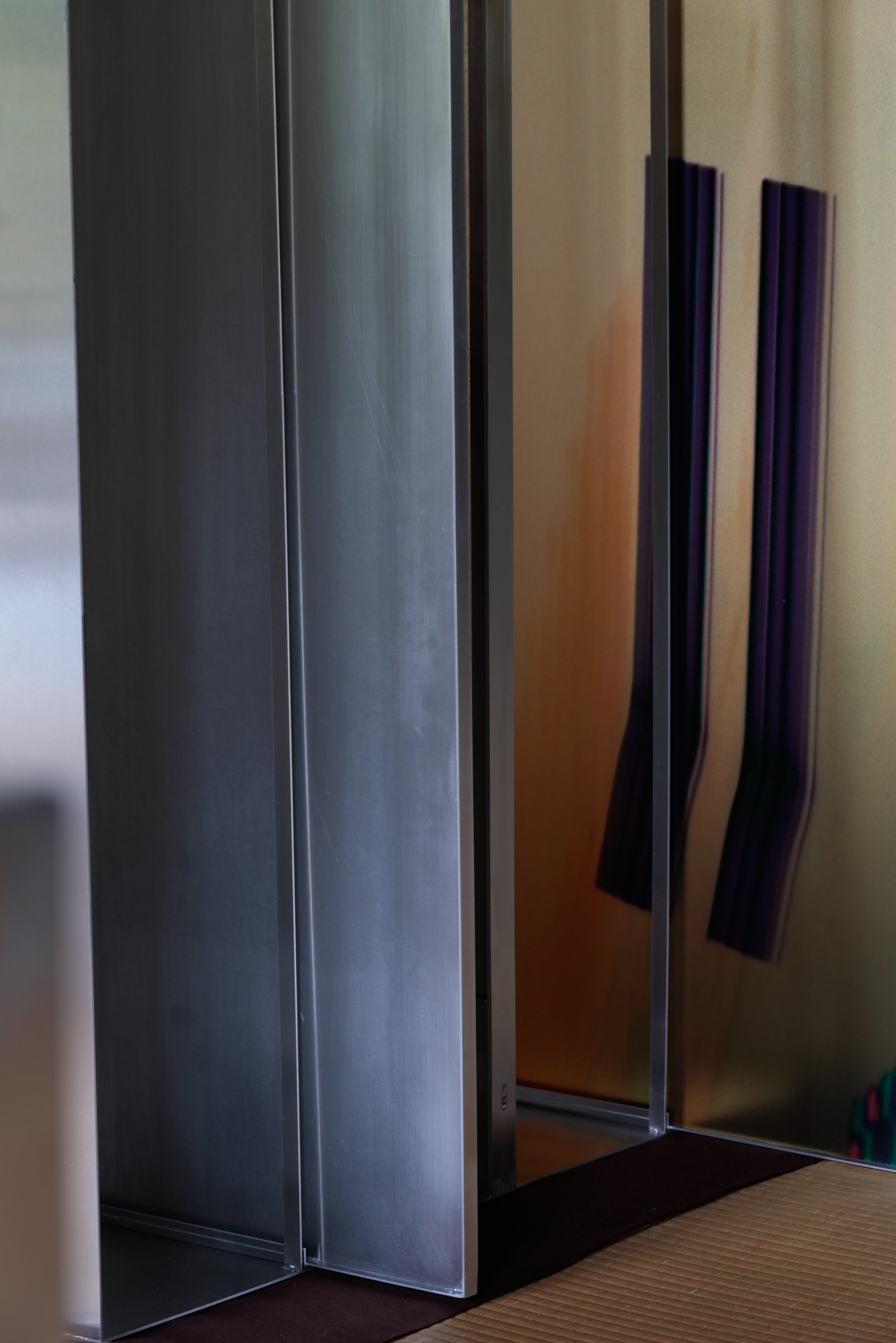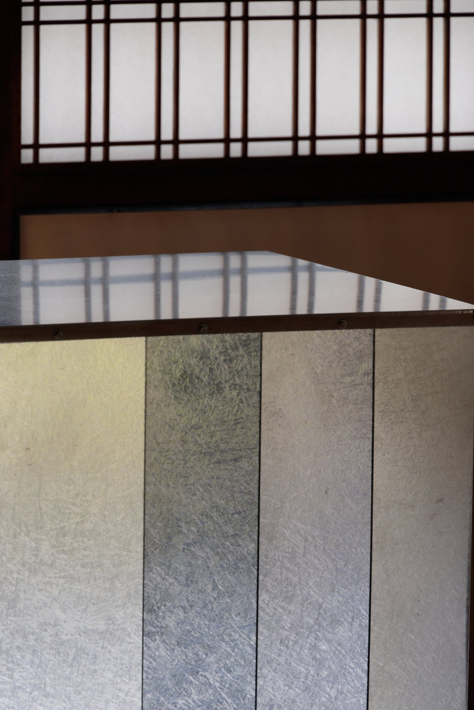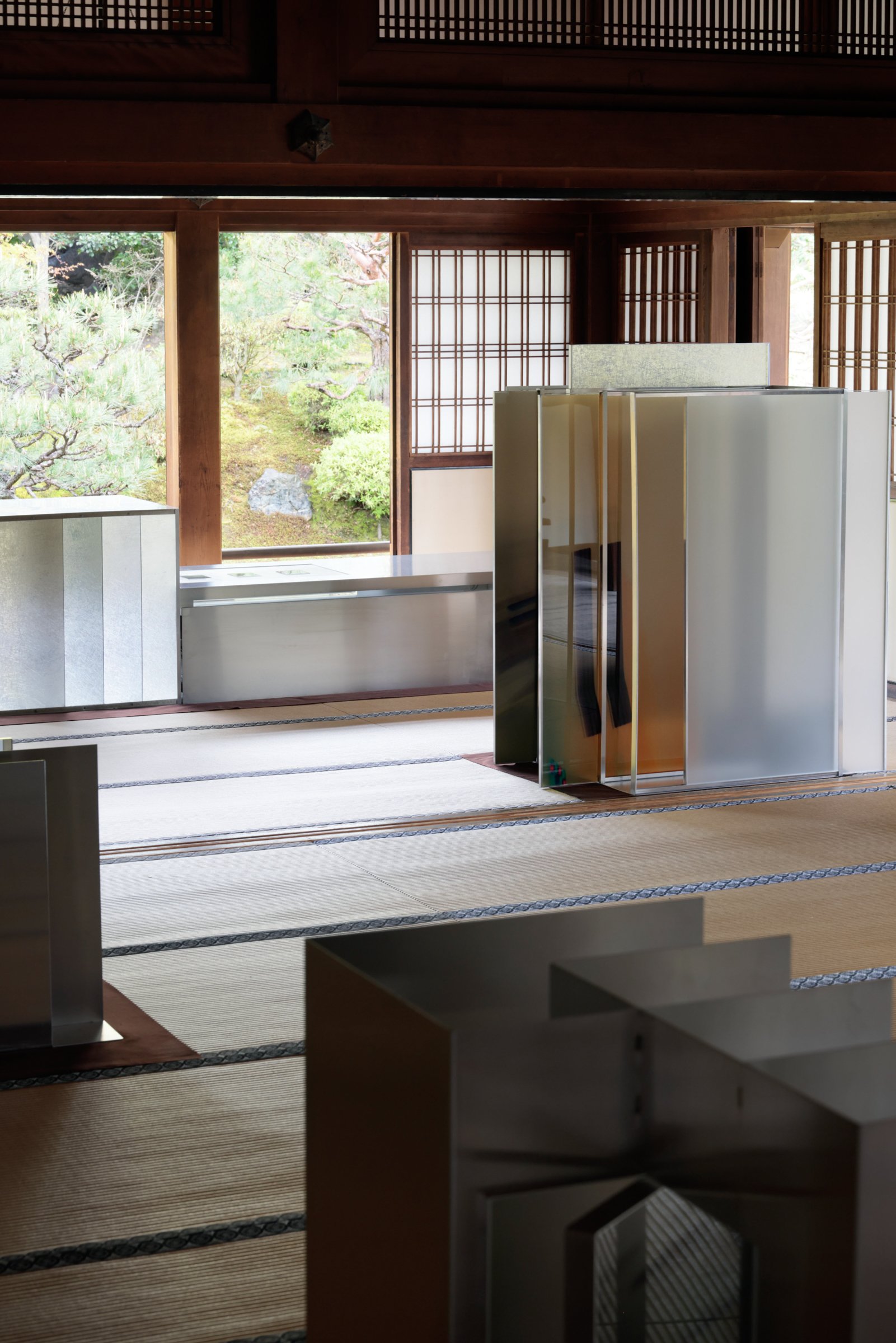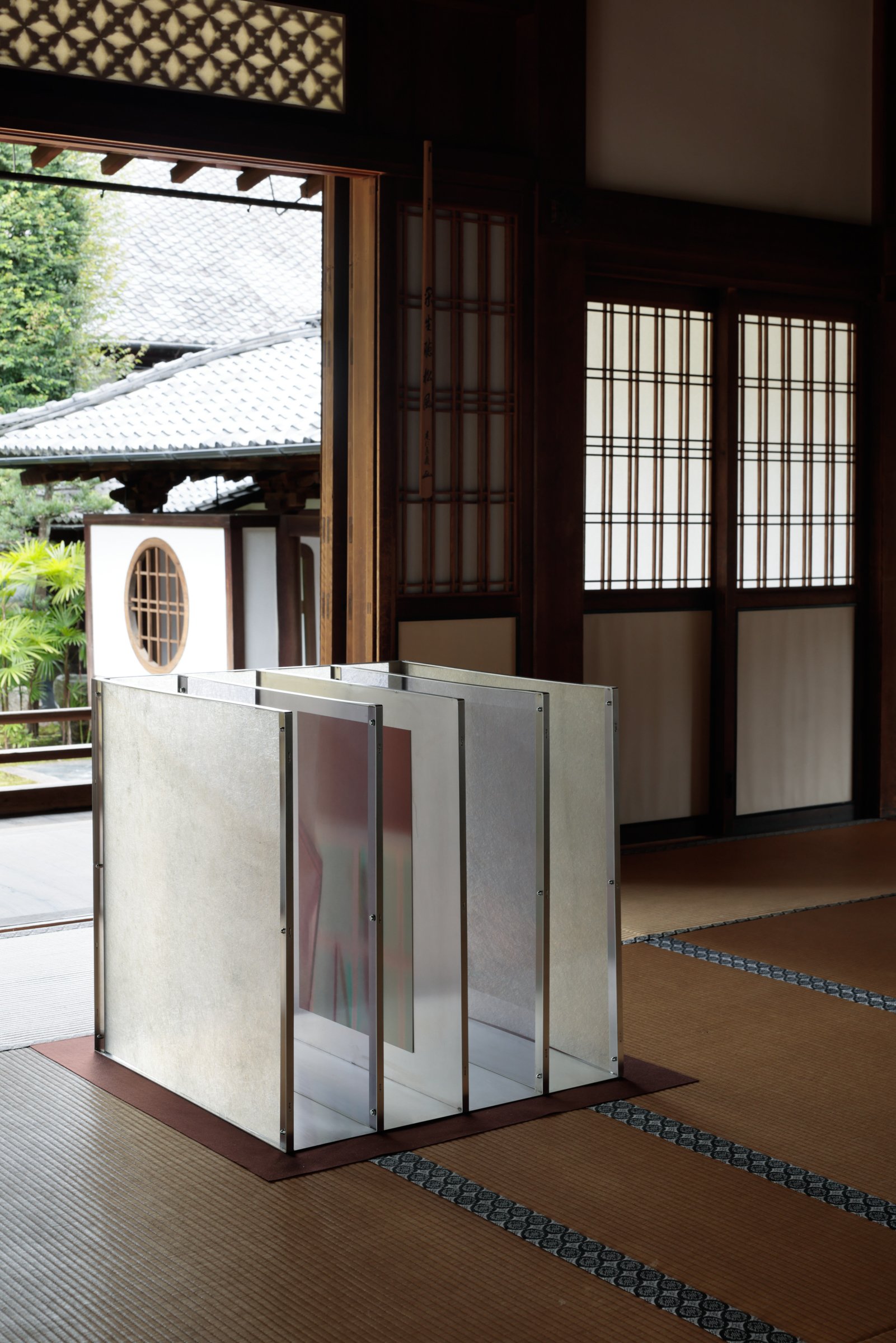 「方丈」の1つ目の部屋では、アルミニウム製のボックスと、「Fragments of Light(光の断片)」のグラフィックプリントを施した銀色の板が設置されている。視点の移動によって変化する反射を観察することで、出現と消失の間にある状態を体感できる。