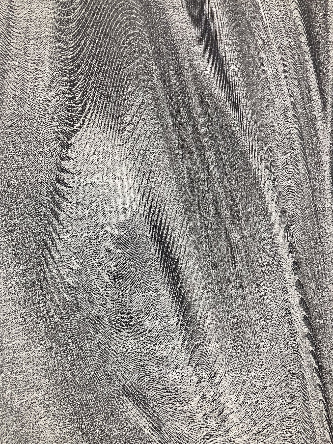 結果として、1枚の生地の上で織り組織が無限に変化し続けるという、従来のジャカード織りでは不可能な“別次元の表現”を実現。サテン織りや平織りといった異なる織り組織がテキスタイル上で微細に変化し続けることで、グラデーションのような豊かな陰影が生まれたという。また、組織図の生成には、流体力学のシミュレーションで用いられる「ベクターフィールド」というプログラムを転用。それにより、特定のモチーフではなく、気流のような流動的な自然現象を織り込んだ有機的なテキスタイルに仕上げた。