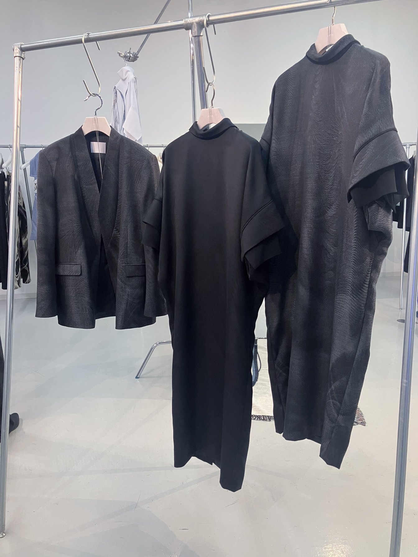ファーストコレクションのラインナップは、セットアップとしても着用できるジャケット(39万6000円)とトラウザー(24万2000円)、ドレス(29万7000円)の3型。ブラックとグレーの2色を用意する。今後は新たなアイテムの製作に加え、さらに実験的で“破滅した”テキスタイルの開発も予定しているという。