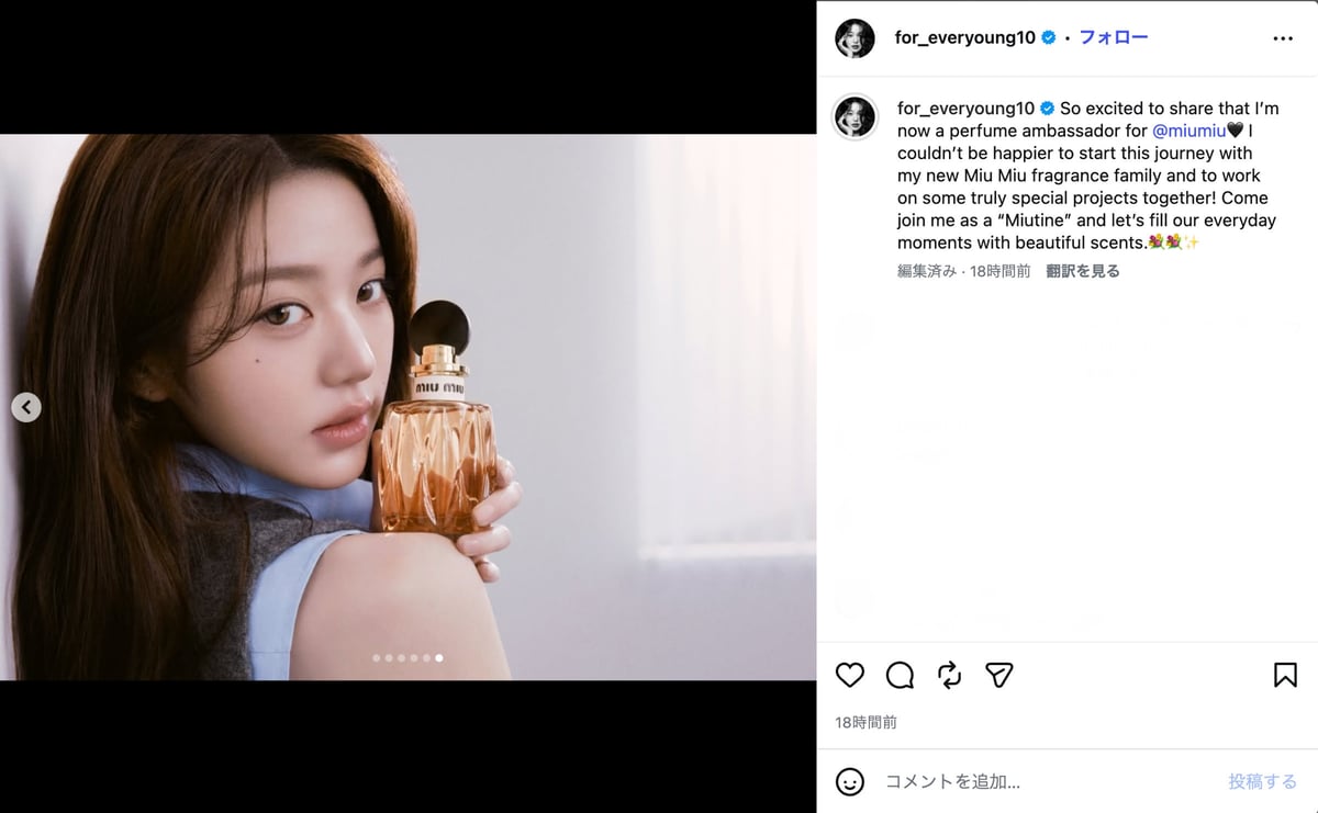 ウォニョンは自身のインスタグラムで、Miutineとともに写るヴィジュアルとコメントを投稿。「新しいミュウミュウのフレグランスファミリーとともに、本当に特別なプロジェクトに取り組めることを、これ以上ないほど嬉しく思います。ぜひMiutineと私と一緒に、日々のひとときを美しい香りで彩りましょう」とファンに呼びかけた。
