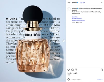 ミュウミュウは、ロレアルグループとのビューティライセンス契約を2024年に締結。2025年夏に締結後初となるフレグランス「Miutine」を発売し、欧米を中心に展開している。ワイルドストロベリーやガーデニア、ブラウンシュガー、バニラアコードを組み合わせた、温かみのあるフローラル調の香り。