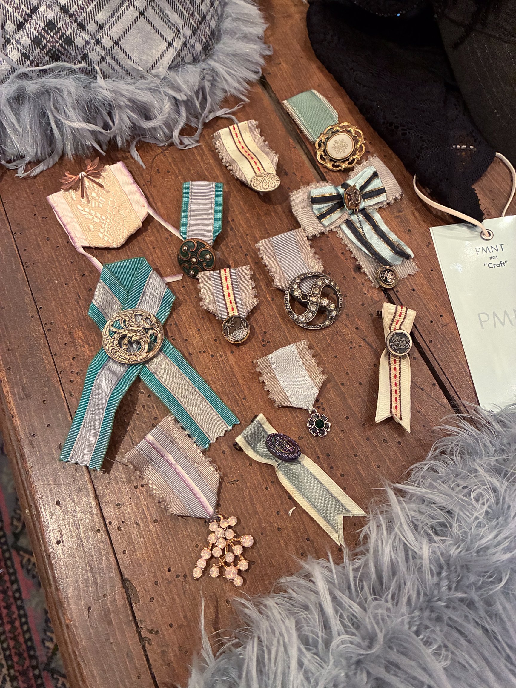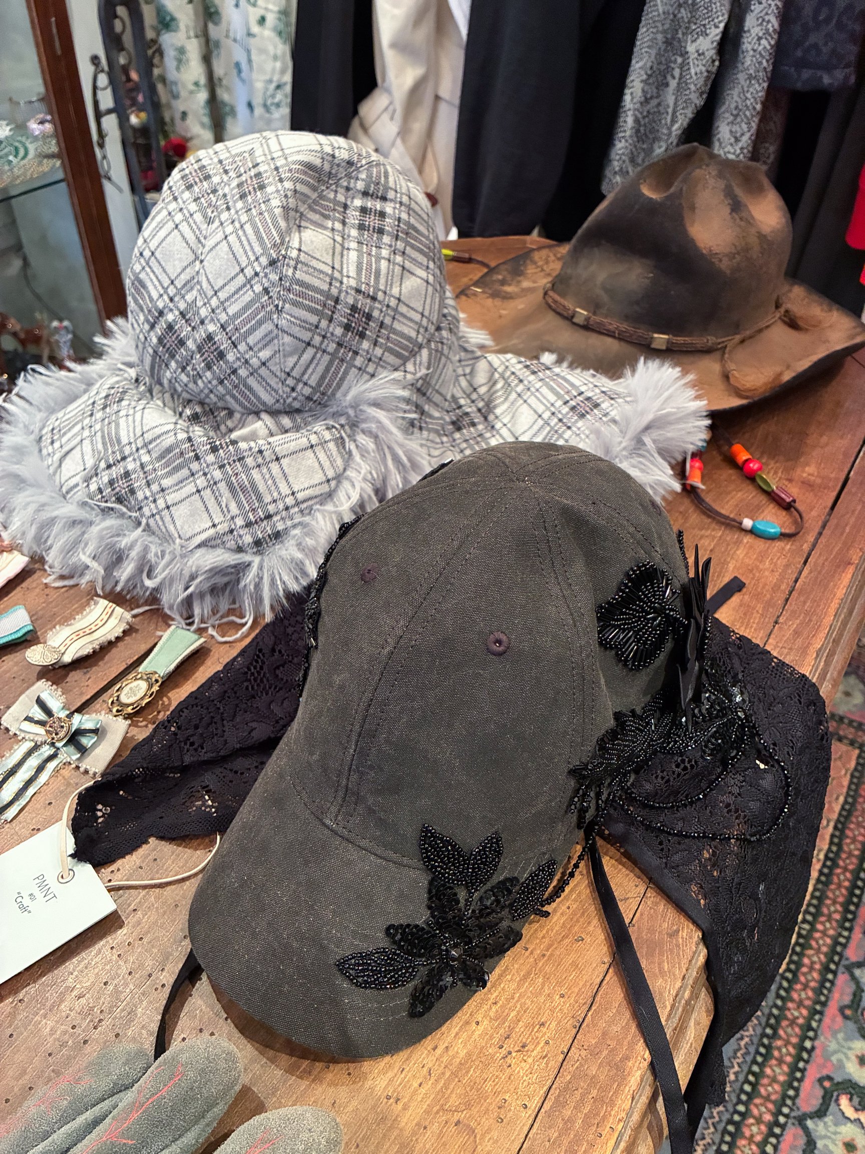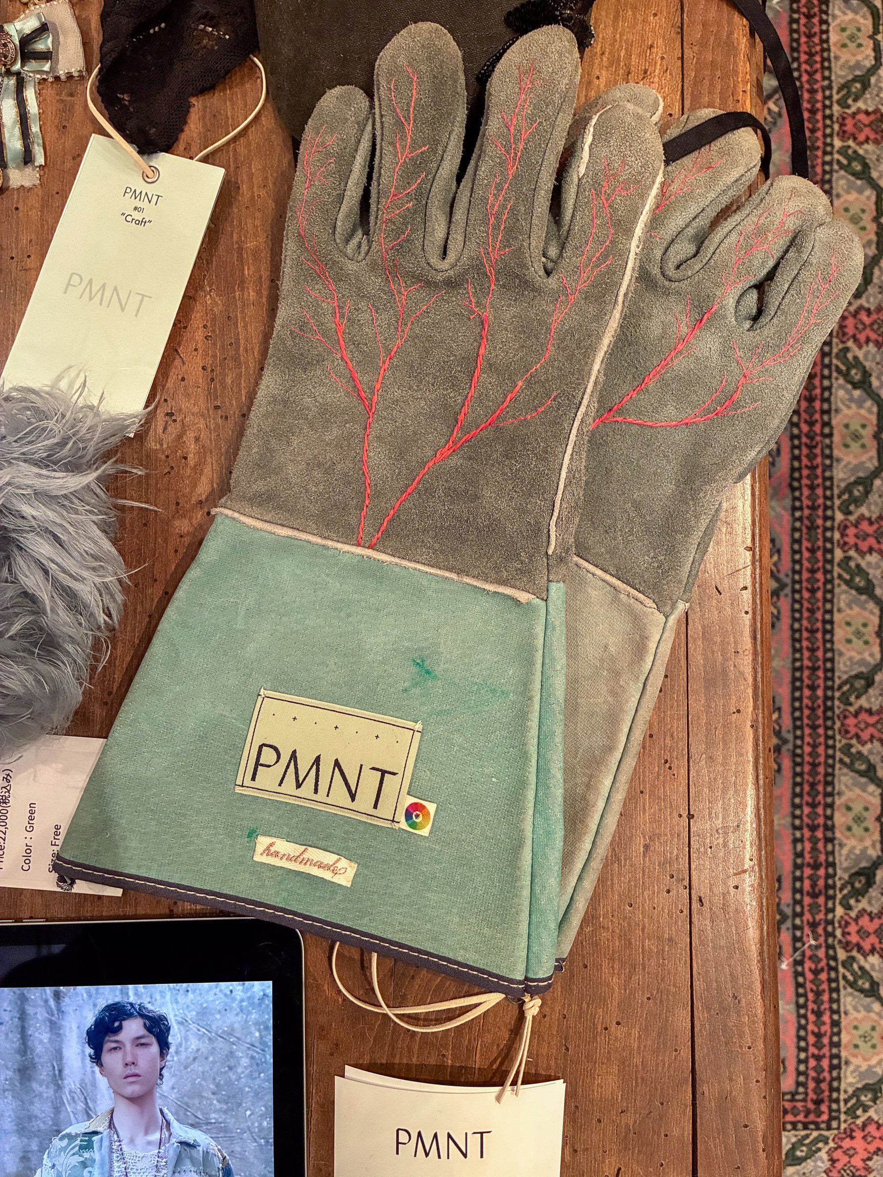 スタイリストという出自を感じさせる提案として、一点投入でコーディネートのアクセントとなる多彩なアクセサリーを用意。長年買い集めてきたアンティークのリボンとボタンで作ったブローチや、ウェアで用いたビーズやレースでデコレーションしたヴィンテージの帽子などを揃える。色みに一目惚れして買い付けたという工業用の古いグローブは、血管を模った刺繍をあしらい一点物のコレクションピースに仕上げた。