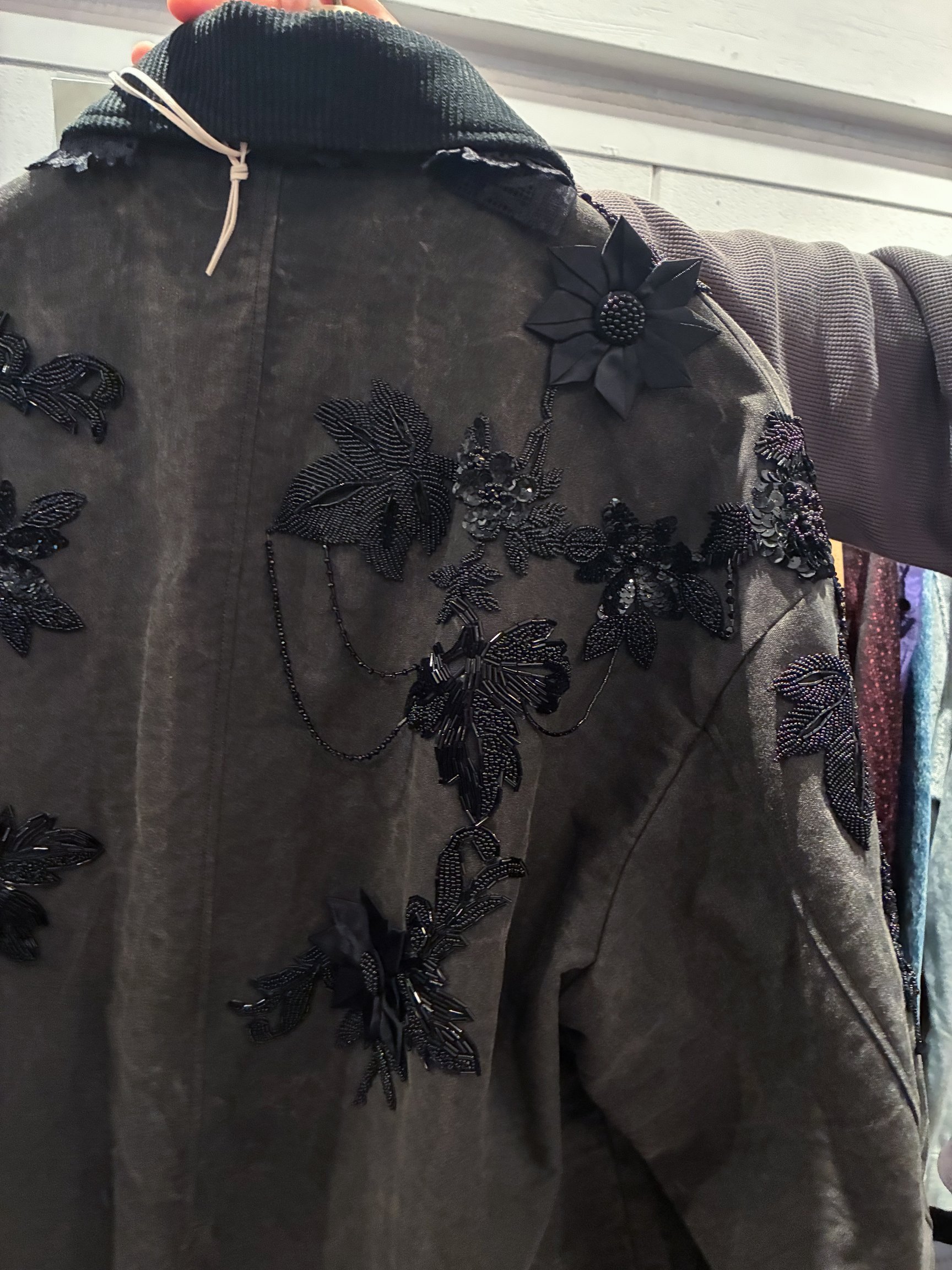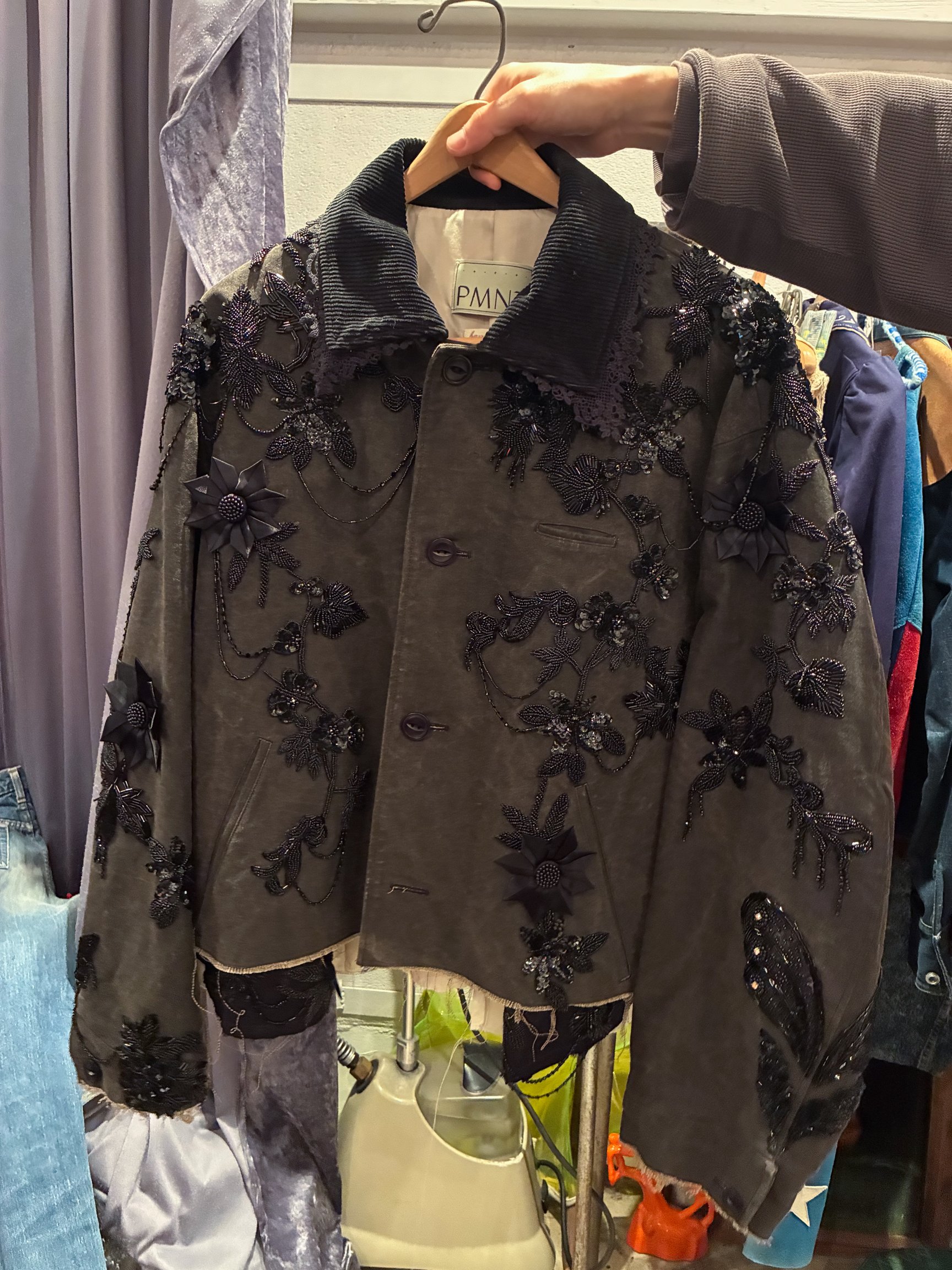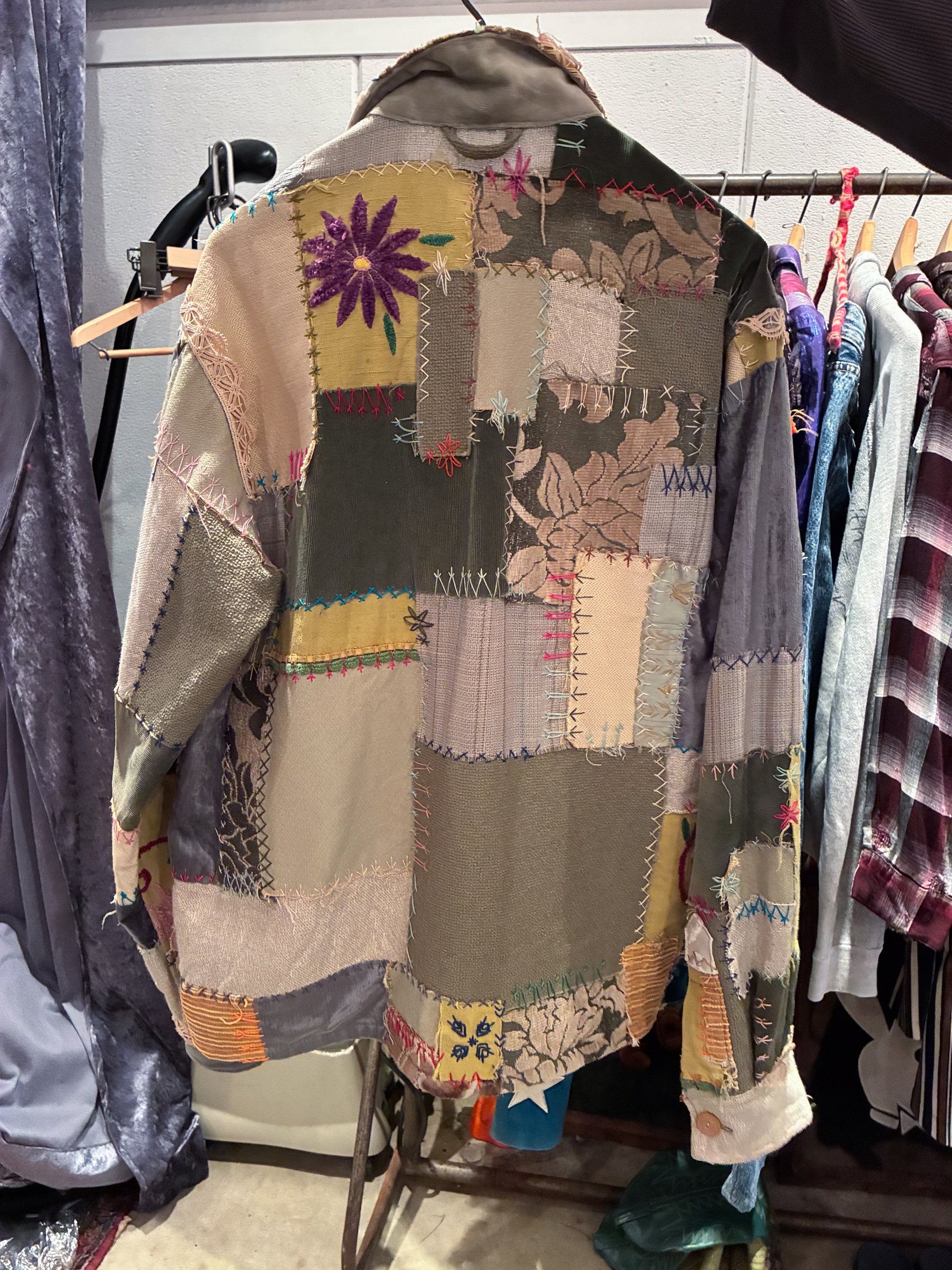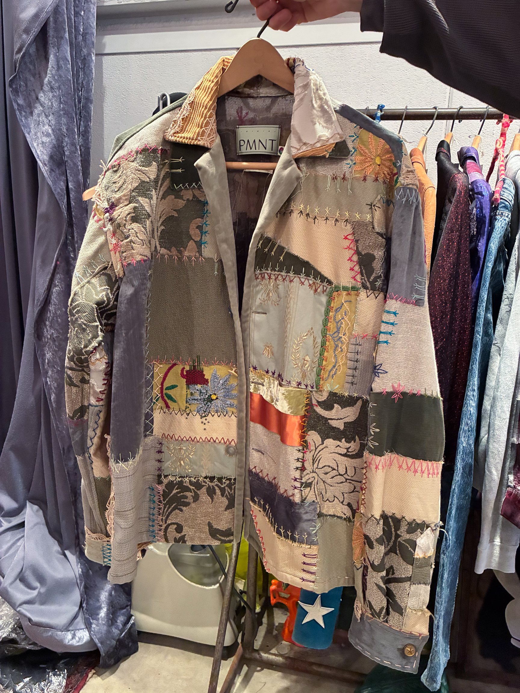 最も象徴的なアイテムと語るパッチワークのジャケットは、アンティークのカーペットや家具生地をアップサイクル。単に生地を接ぎ合わせるだけでなく、至るところに刺繍をあしらって「古物とハンドクラフトの融合」というブランドの核を表現した。手仕事の跡を感じてほしいという思いから、始末が見えるように半透明の裏地を採用。同ジャケットも含め、アップサイクルのアイテムは素材のストック次第で不定期に製作を続けていくという。
