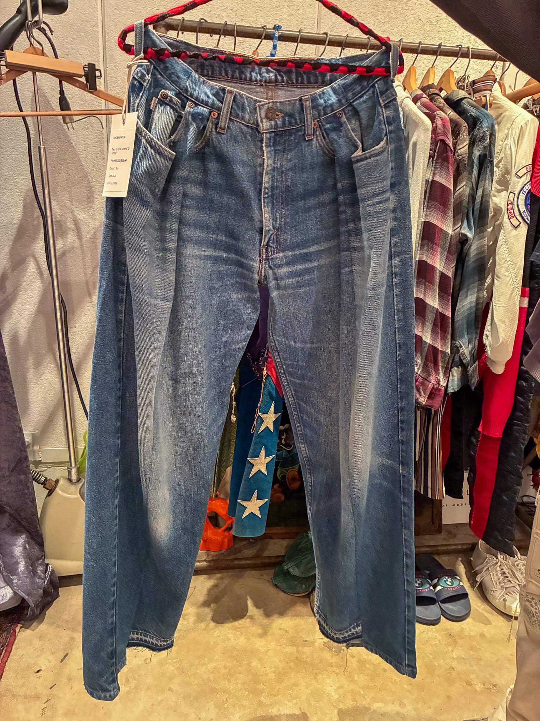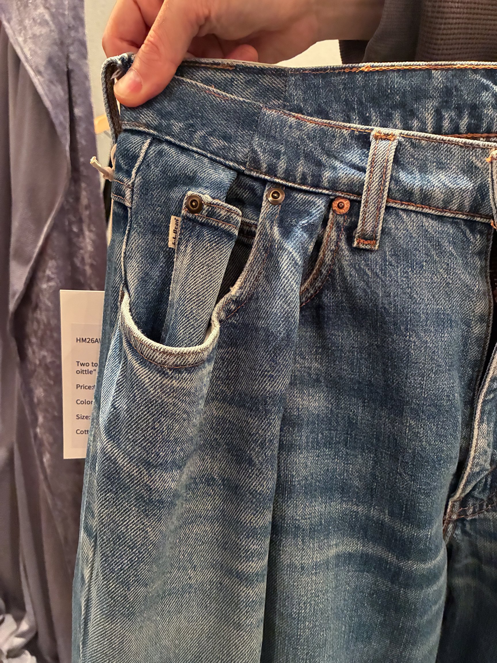 デビューコレクションでは、ディレクター自身が最も頻繁に着るというメンズウェアの定番品に、ヴィンテージやハンドクラフトの要素をプラス。裾と袖口が切りっぱなしの短丈のワークジャケットは全面に繊細なビーズ刺繍をあしらい、古着のジーンズをドッキングしたパンツはトラウザーズ同様に2タック仕様にするなど、ハイアンドローのコントラストが目を引く。同パンツは2つのジーンズのフロントポケットが重なるように接ぎ合わせており、そこにタックを入れることでユニークな表情に仕上げている。