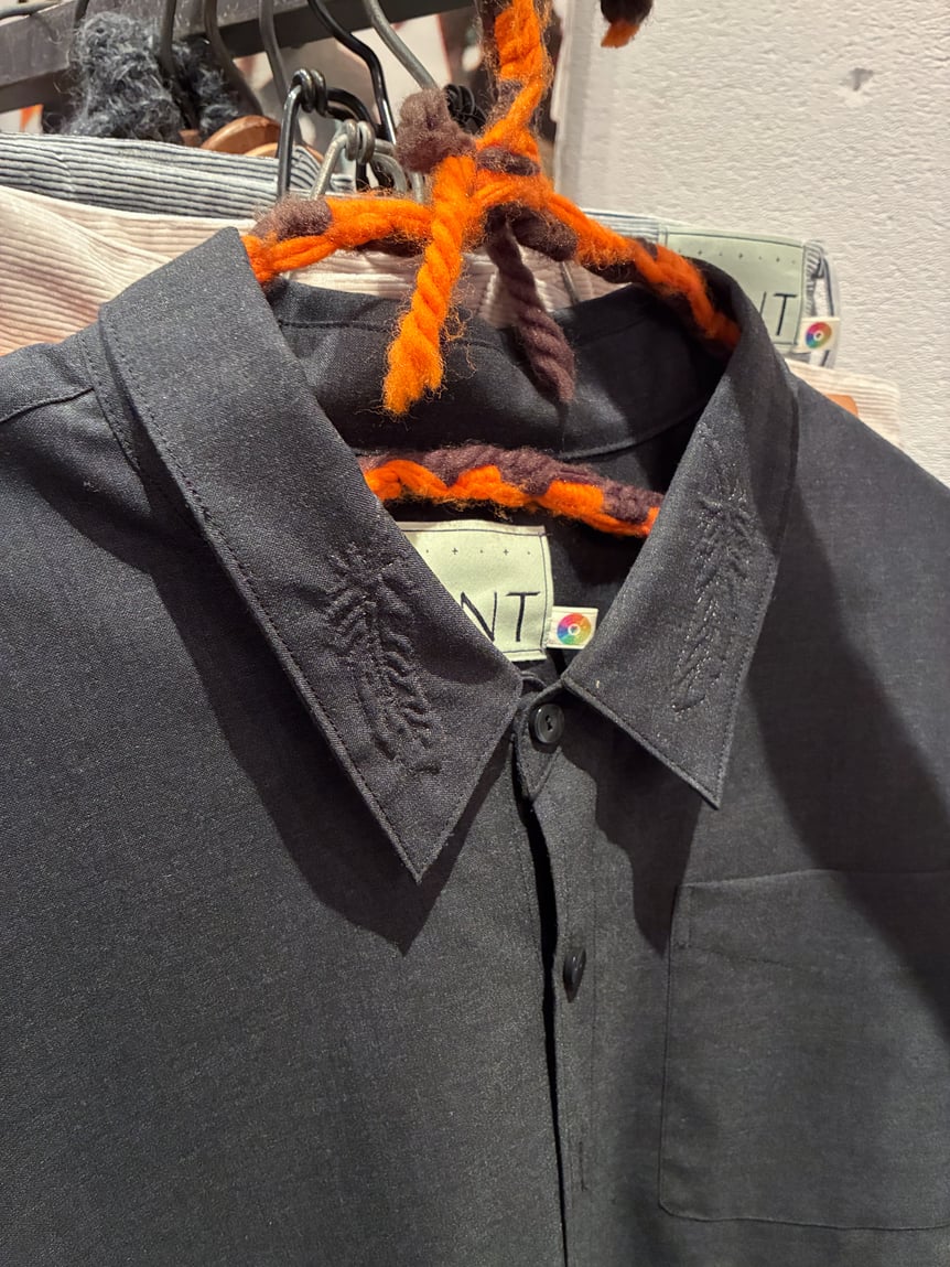 「納得できないリブを既製品から選ぶくらいなら、1からオリジナルで編めばいいと思った」と語ったスタジャンは、首と裾のリブ、袖をノルディック柄のニット生地で切り替え。シンプルなウールシャツは襟羽に南フランス伝統のブティ刺繍(柄の中に詰め物をして立体的に表現する技法)を施すなど、見慣れた色や形の日常着にひと匙の違和感や遊び心を潜ませた。