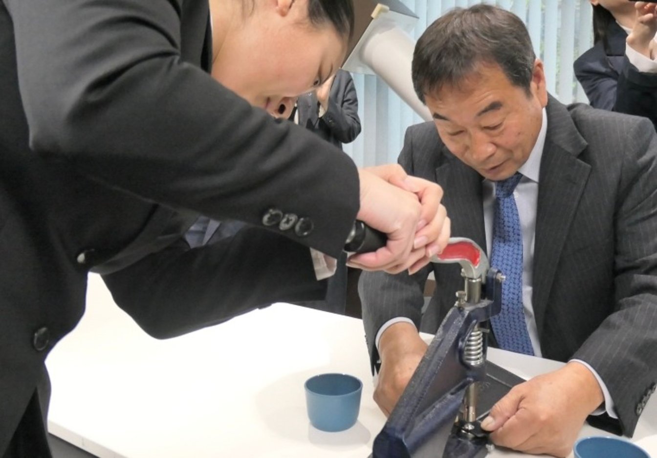 ホックの打ち付けを終えた新入社員たち