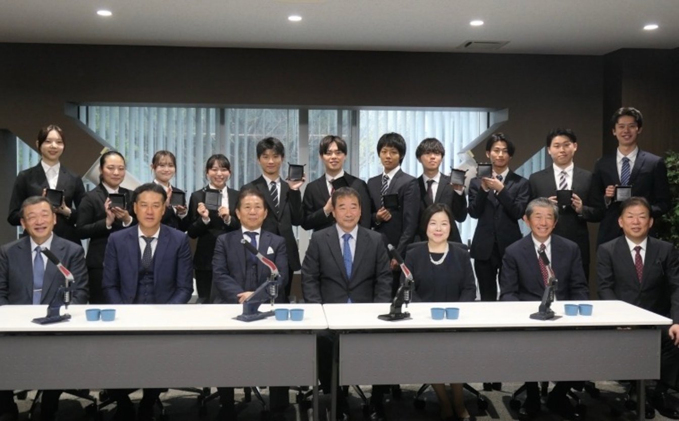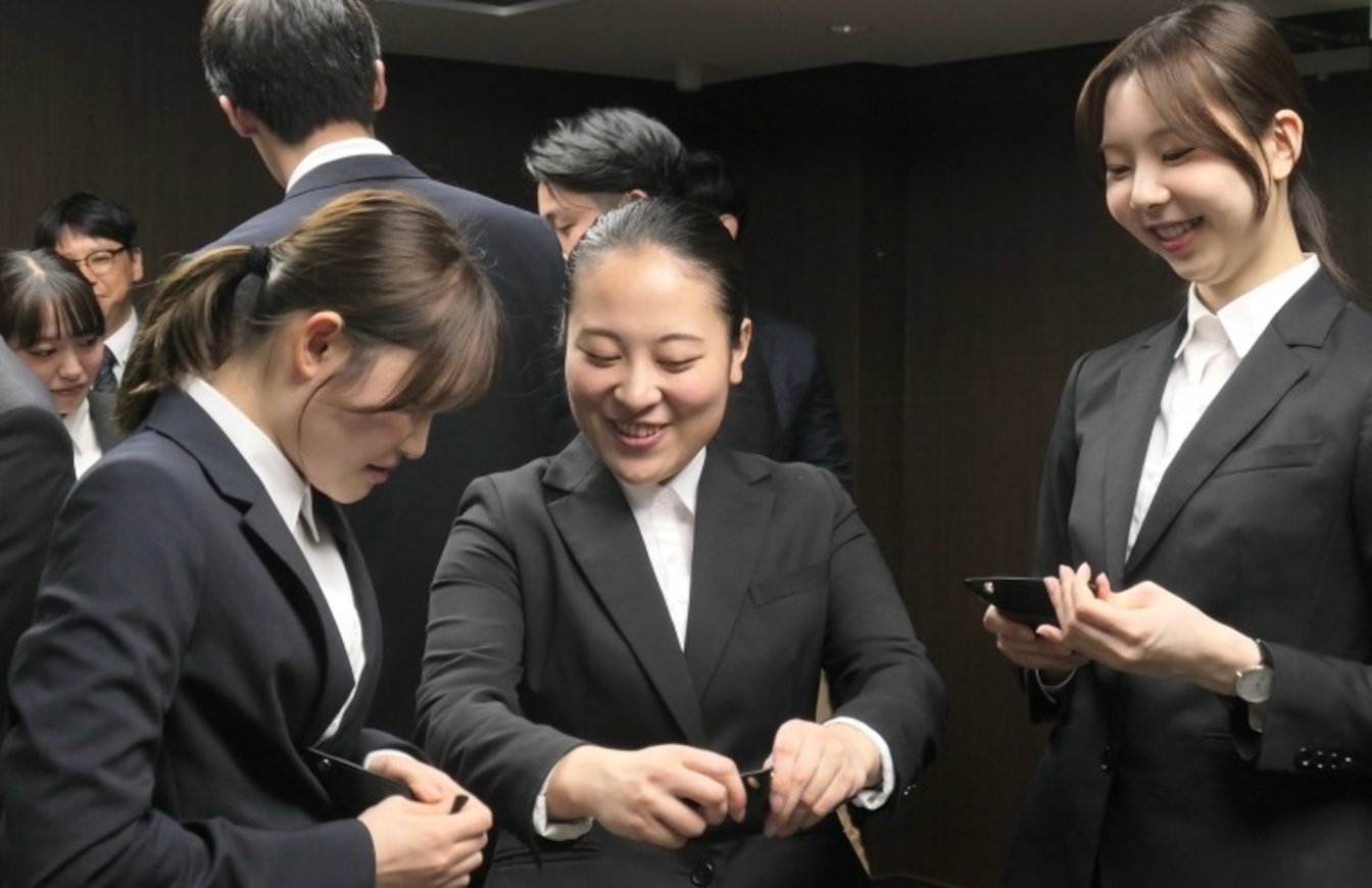 入社後の初仕事はホックの打ち付け――。服飾副資材を主力とするモリトは4月1日、大阪市の本社ビルで入社式を開いた。そのなかで、新入社員が同社の社長や役員とともに、モリトを象徴する商品である金属ホックを打ち付けて小物入れを作るという体験型プログラムを実施した。